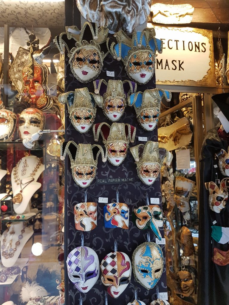 Vom ersten Blick an hat uns die Stadt sehr gut gefallen! Wir hatten bestes Wetter und konnten tolle Ausblicke auf die vielen kleinen Kanäle genießen. Obwohl die Stadt natürlich sehr touristisch geprägt ist, war es nicht von Touristen überfüllt. Dies verdanken wir vermutlich einerseits Corona, andererseits ist es inzwischen Oktober und somit keine Hauptsaison mehr. Trotzdem gab es an allen Ecken und Enden „Touri-Kram“ zu kaufen. Wir haben natürlich auch unseren Magneten für die Magnetwand zu Hause ergattert. Auswahl gab es wahrlich genug – Stände voller Magnete, T-Shirts, Taschen, Tassen etc. reihten sich aneinander. Mir persönlich gefällt dieses Feeling aber durchaus. Außerdem gibt es auch genug Gassen abseits des Trubels, wo es ruhiger zugeht. Eine weitere Besonderheit, auf die wir immer wieder gestoßen sind, sind die typisch venezianischen Masken.