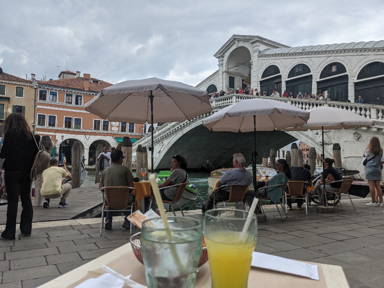 Unser Mittagessen nahmen wir direkt an der Rialto-Brücke ein. Es gab Pasta für Sven und Bruschetta für mich. Außerdem freuten wir uns über ein kühles Getränk. Durch das Spazieren durch die Stadt war uns doch etwas warm geworden 😊