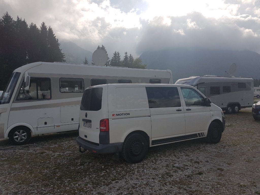 Der graue Fleck ist übrigens diesmal nicht auf der Windschutzscheibe; das ist wirklich eine graue Wolke! 😂Als wir dann in Österreich waren, musste doch langsam eine Entscheidung getroffen werden, wo wir die Nacht verbringen wollten. Ansonsten wären die Berge schon wieder vorbei gewesen. Wir peilten die Zugspitze, also Gamisch-Partenkirchen, an und fanden dort auch einen schönen Campingplatz. Theoretisch hat man hier einen schönen Blick auf die Zugspitze… in der Realität sieht man in dieser Richtung vor allem Wolken 🤷‍♀️
