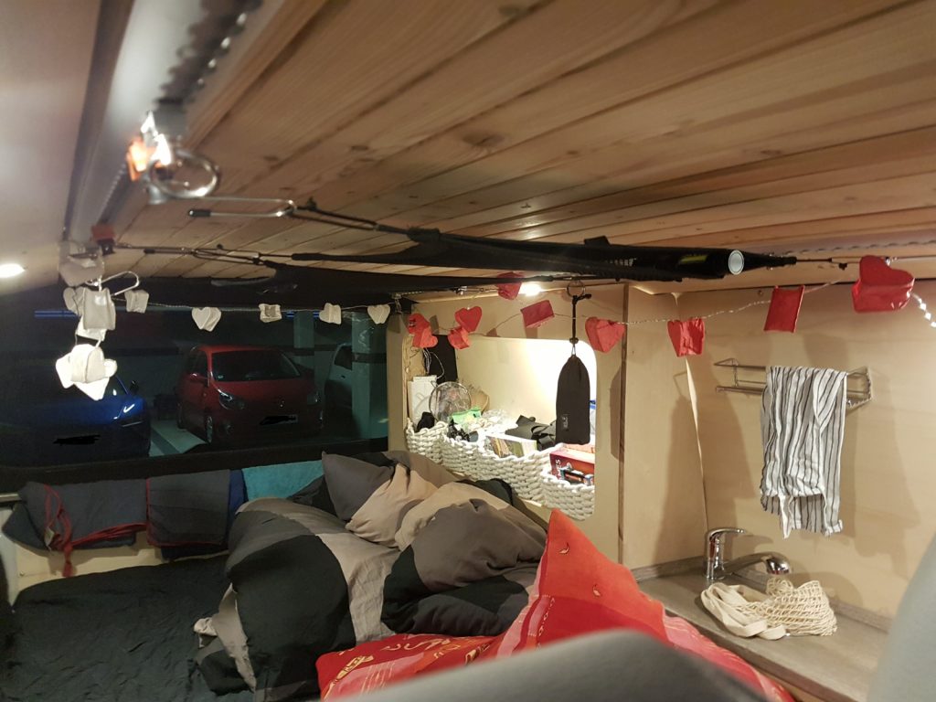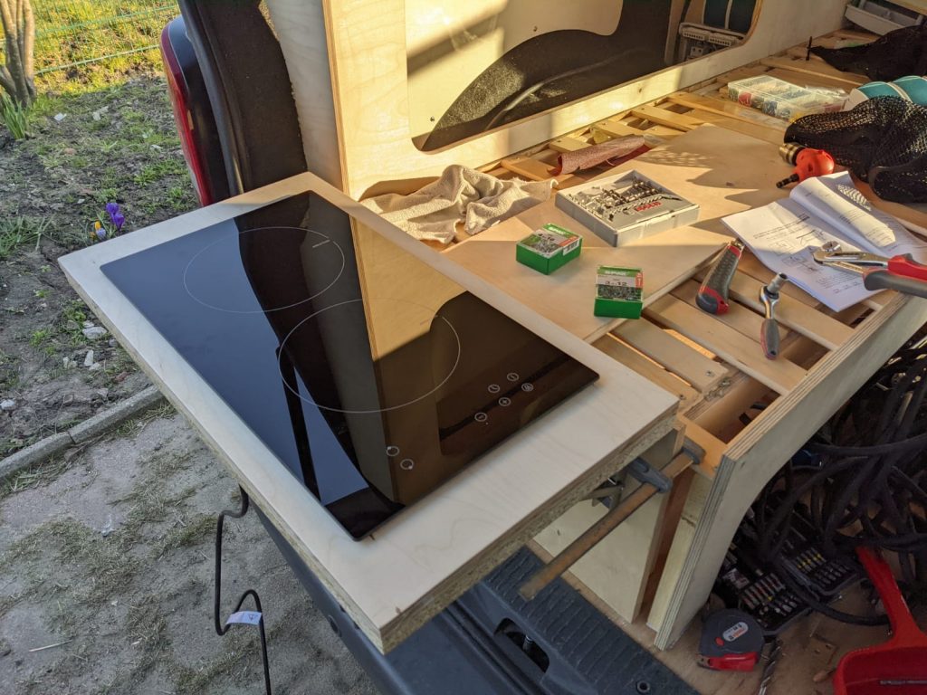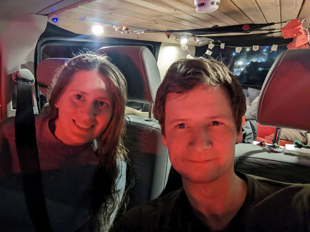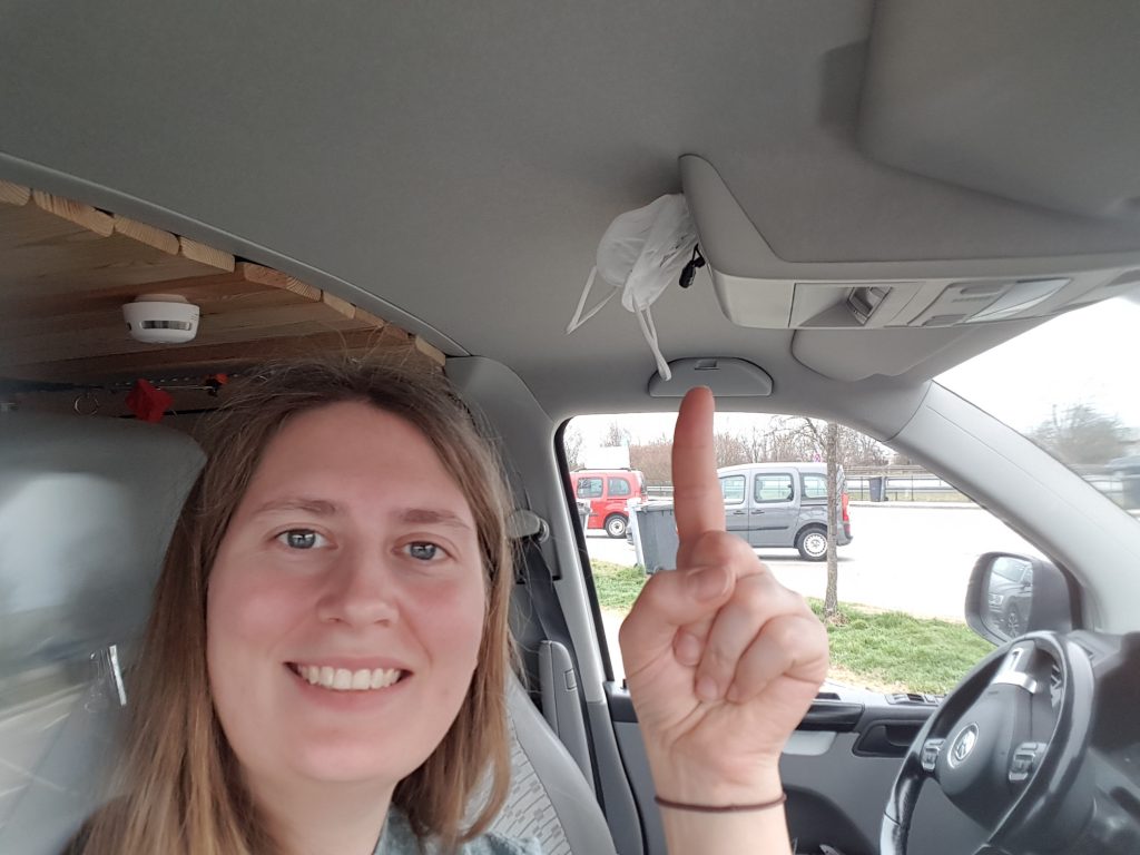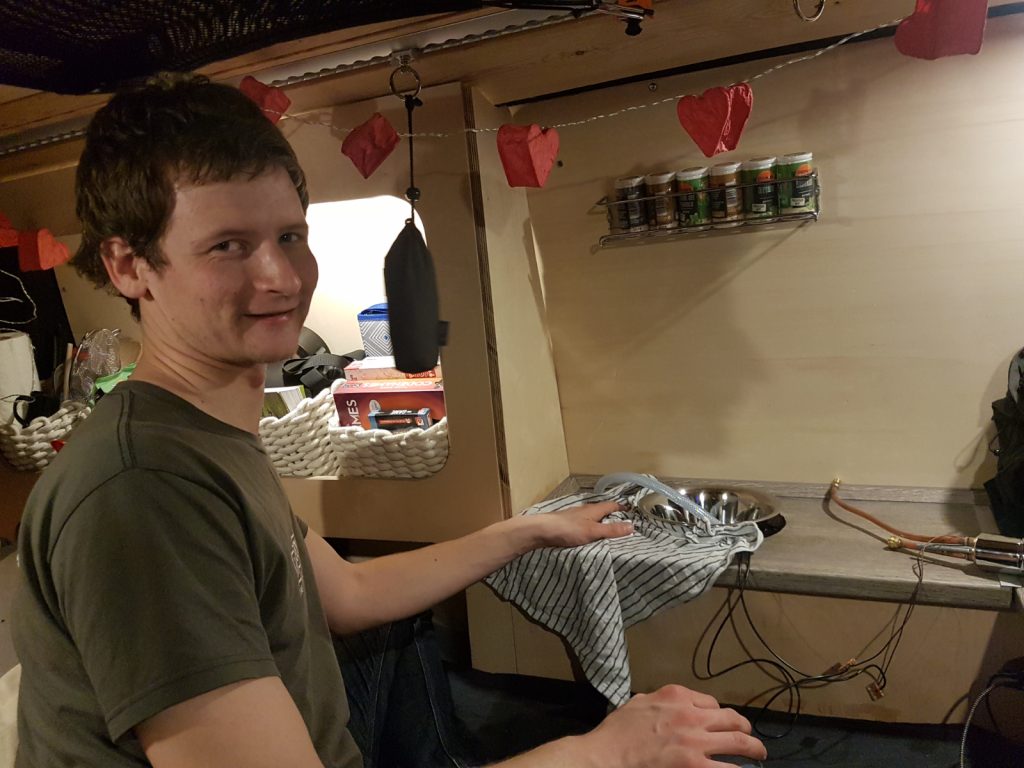 Aber fangen wir von vorne an… Sven konnte heute spontan schon einen Urlaubstag nehmen und dementsprechend haben wir uns dazu entschlossen schon am Donnerstagabend loszufahren. In den letzten Wochen hat Sven schon fleißig an Basti gebaut. Es gibt ein neues Kochfeld, einige neue Elektronikelemente (von denen ich keine Ahnung habe und sie euch dementsprechend auch nicht näher erläutern kann), wir haben Frischwasser, Abwasser und eine Spüle (und seit Mittwochabend auch einen Wasserhahn, merkt euch dieses Detail, es wird noch eine wichtige Rolle in diesem Blog spielen!) und es gibt auch einige neue Innenelemente, von denen ich deutlich mehr Ahnung habe. In unserem Schrank, der inzwischen auch Seitenwände hat, stehen vier Stoffkörbe, so dass ein bisschen Stauraum für Kleinkram geschaffen wurde. Außerdem ziert seit Donnerstag ein Gewürzregal die Wand von Basti und nicht zuletzt habe ich pünktlich zu Fahrtbeginn selbstverständlich auch die Lichterketten wieder angehängt! 😎 Sven konnte seine Freude kaum verbergen!