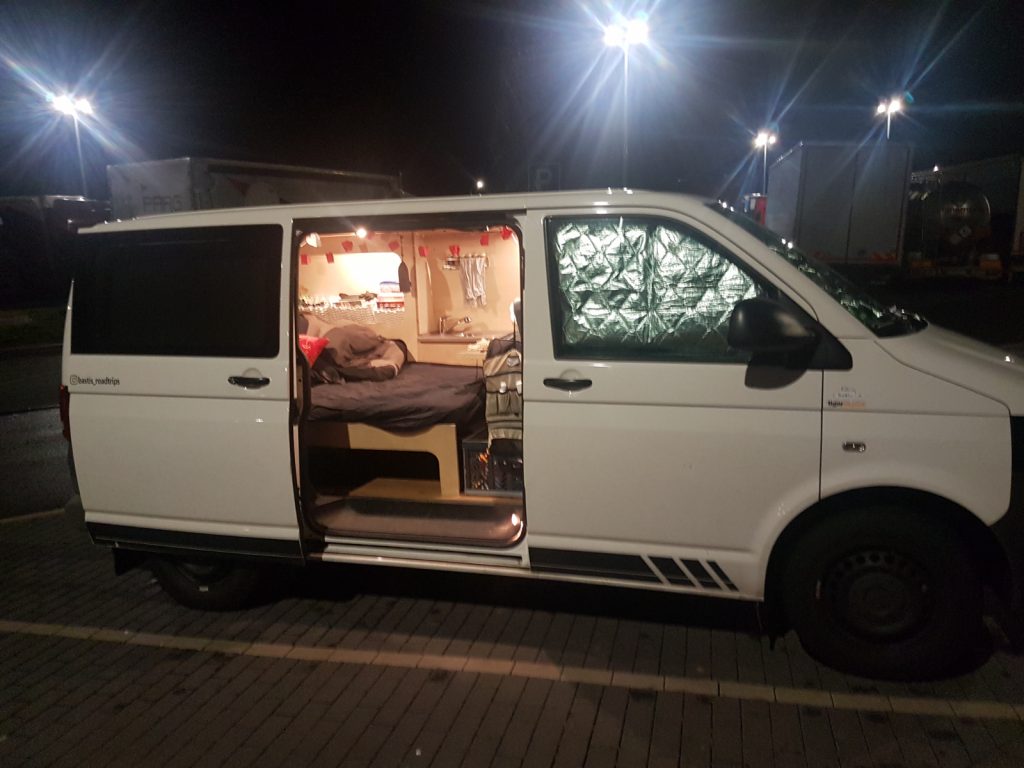 Voller Elan, gesättigt und mit guter Laune ging es also um 21 Uhr los. Um 21:15 standen wir im Stau… 🙄 Zum Glück war es nur eine kleine Verzögerung kurz vorm Elbtunnel, aber wir hatten schon gut etwas zu lachen! Das Hörbuch von Hape Kerkeling war sehr interessant und wir fuhren ungefähr die ersten 250km bis Sven langsam müde wurde. Es war inzwischen auch fast Mitternacht, sodass wir uns nach einem Rastplatz umsahen. Auch das klingt einfach als es war… der erste Rastplatz war brechend voll mit LKWs. Selbst mit unserem kleinen Basti fanden wir keinen Schlafplatz. Beim nächsten Versuch hatten wir mehr Glück (weil es einen Bereich gab, der nur für PKWs war 😅) und so schlugen wir auf dem Rastplatz Börde unser Nachtlager auf. Nun fing das Spektakel erst richtig an!