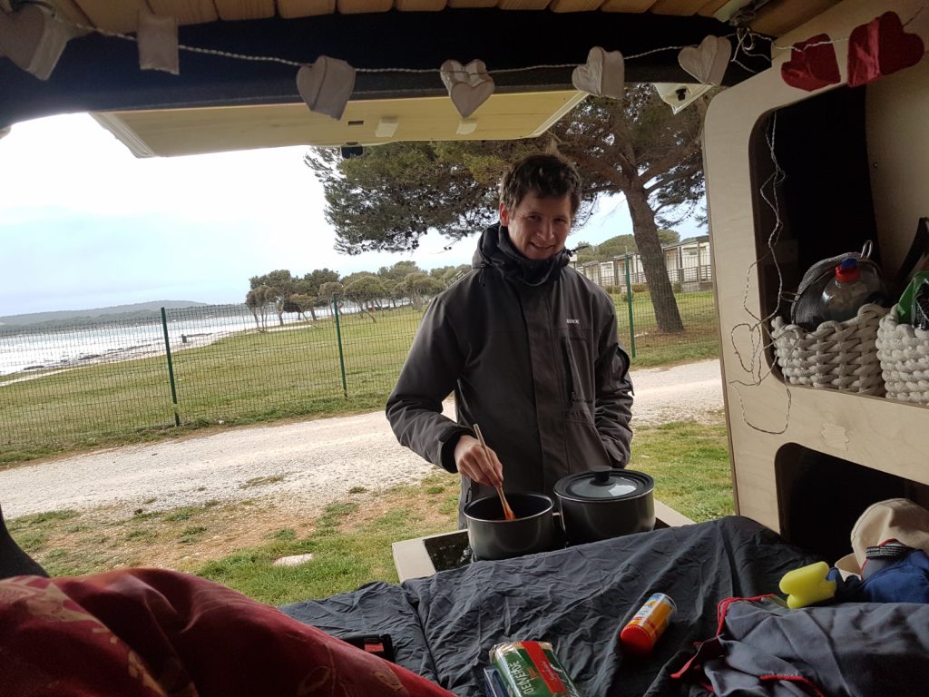 Sven (der natüürlich einen Windmesser dabei hat… 🤷♀️🤷♀️🤷♀️) hat Windstärke 7 gemessen und war trotzdem hoch motiviert, das neue Kochfeld einzuweihen. Auf Campingplätzen können wir Basti nun an den Strom anschließen und damit das Induktionskochfeld nutzen. Ich bestand auf das Gericht, das möglichst wenig Zeit genötigt, es gab also Spaghetti Bolognese 😅 Nur das Abwaschen hinterher war nicht so angenehm. Der Wind war gefühlt noch stärker geworden und die Temperatur ging eher bergab.