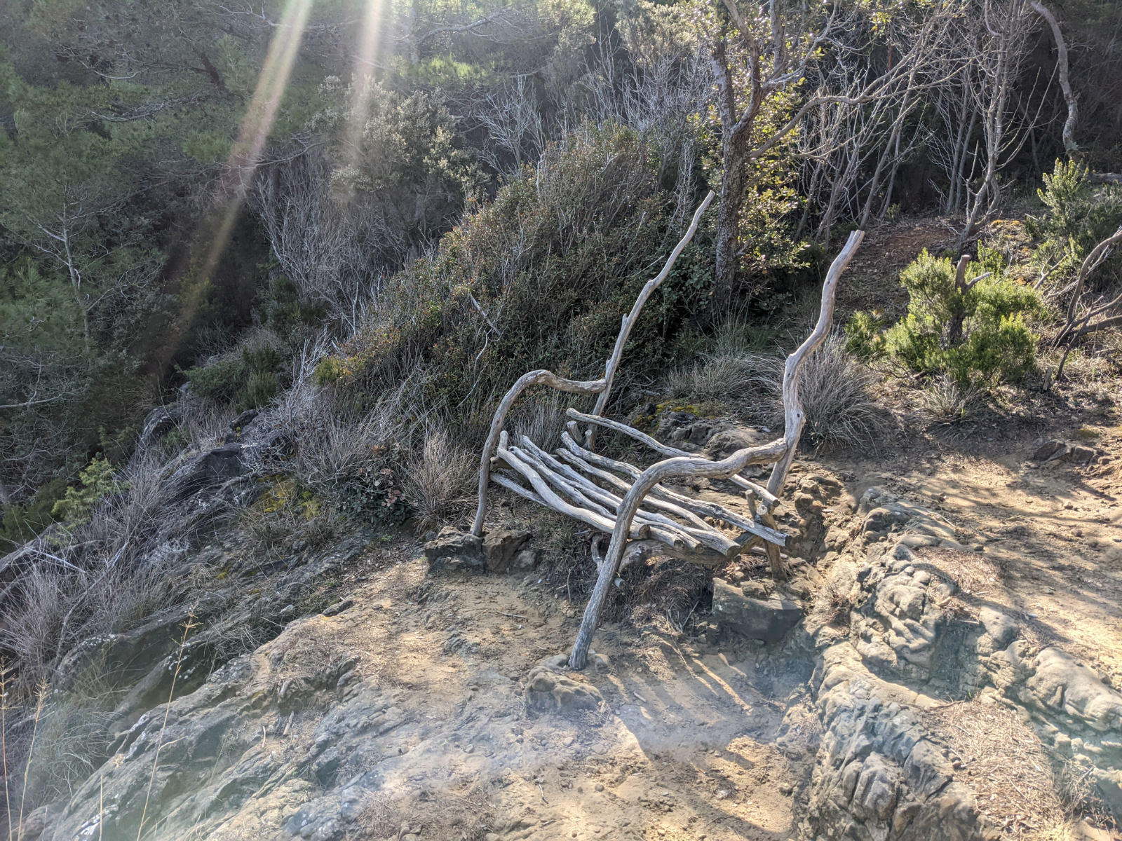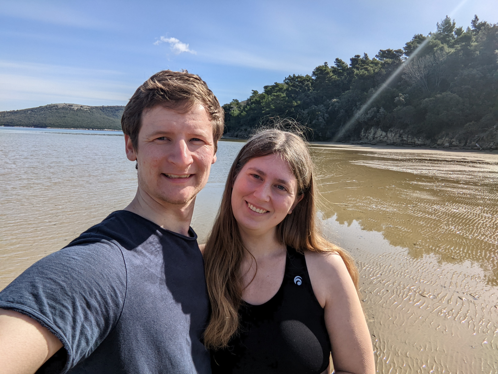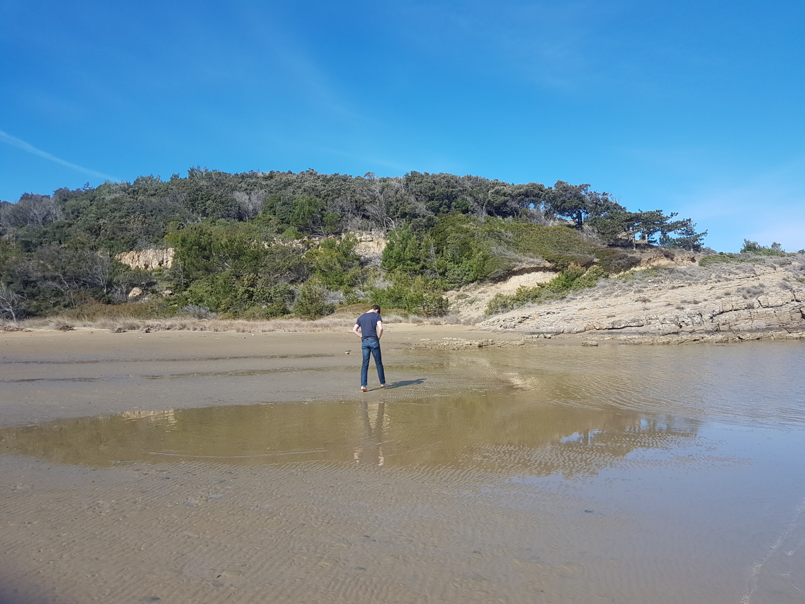 Nachdem gegen 9 Uhr ein Auto auf den Parkplatz fuhr und ein freundlicher Kroate uns darauf hinwies, dass Wildcampen verboten sei und von der Polizei geahndet werden würde, packten wir so weit zusammen (Sven hatte noch seine Solarzellen ausprobiert…) und beschlossen noch einen kleinen Spaziergang zu machen. Der Parkplatz war dort mitten im Wald, weil ein kleiner Pfad zum Strand hinunter führte. Den Strand wollten wir uns nicht entgehen lassen, obwohl wir keine großen Erwartungen  hatten. Ich schwankte zwischen Flip-Flops und Turnschuhen, da der Weg recht steil nach unten führen musste. Da die Sonne aber schon prall am Himmel schien und wir schließlich zum Strand gehen wollten, gewannen die Flip-Flops (zu Svens Unverständnis… 🤷‍♀️). Im Nachhinein war das eine gute Wahl, obwohl der Weg durchaus steil und steinig war. Svens Arm funktioniert aber als Haltegriff ganz gut!