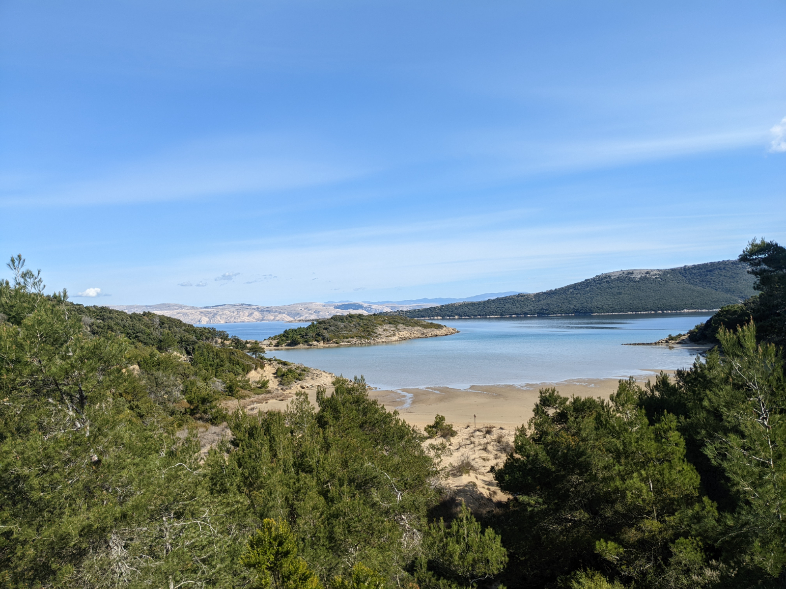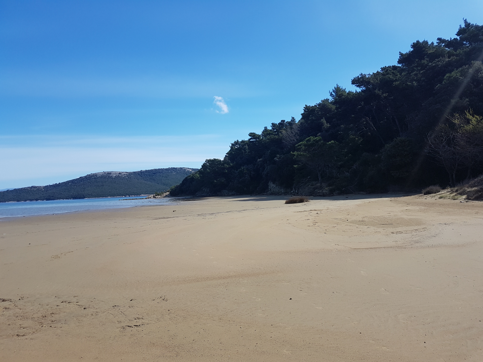 Der Weg hinunter zur Küste war schon schön und ließ auf ein nettes Plätzchen hoffen. Aber als wir dann wirklich unten waren, war es atemberaubend schön! Es wirkte richtig paradiesisch! 🤩 Es erwartete uns eine große Bucht mit Sandstrand (das ist in Kroatien schon ein 6er im Lotto!), wunderschöne kleine Inseln im Meer und das alles menschenleer. Wir hatten die ganze Bucht für uns!