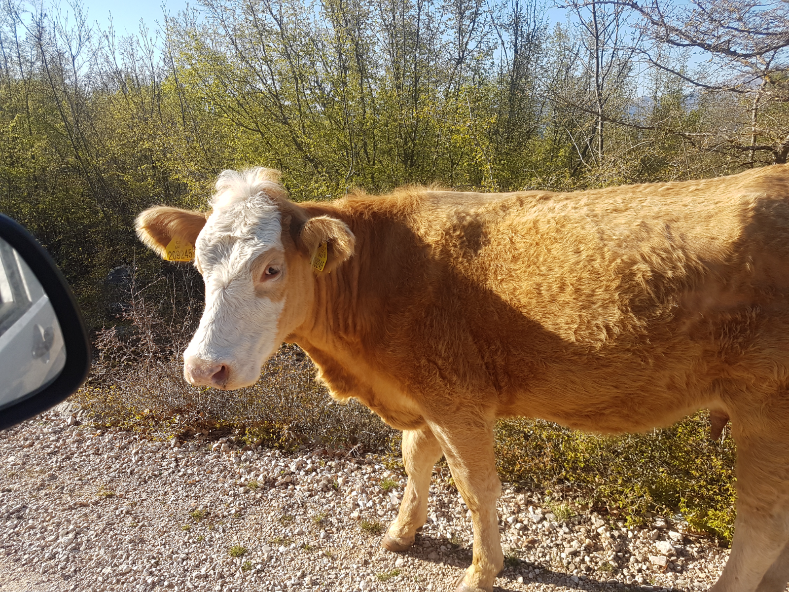 Sven fuhr bereits eine gewisse Zeit hinter dieser sehr süßen Kuh hinterher, ohne dass so recht Platz für ein Überholmanöver gewesen wäre. Die Kuh trottete ganz gemächlich auf der Straße entlang. Nur wenn Sven ihr zu nah kam, trabte sie ein kurzes Stückchen. Auf den Gedanken, dass sie mal zur Seite gehen könnte, kam sie anscheinend nicht. Als das Foto entstand, konnte Sven gerade vorsichtig überholen als ich rief: „Halt mal an, ich möchte sie streicheln! Sie hat so süße Plüschohren!“ Unter Protest tat Sven wie ihm geheißen, doch als ich die Hand ausstreckte, trabte die Kuh wieder an und setzte sich erneut direkt vor Basti. Wir fuhren also wieder ganz gemächlich hinter ihr her. Beim nächstmöglichen Überholmanöver wollte Sven dann komischerweise nicht nochmal anhalten! 🤷‍♀️