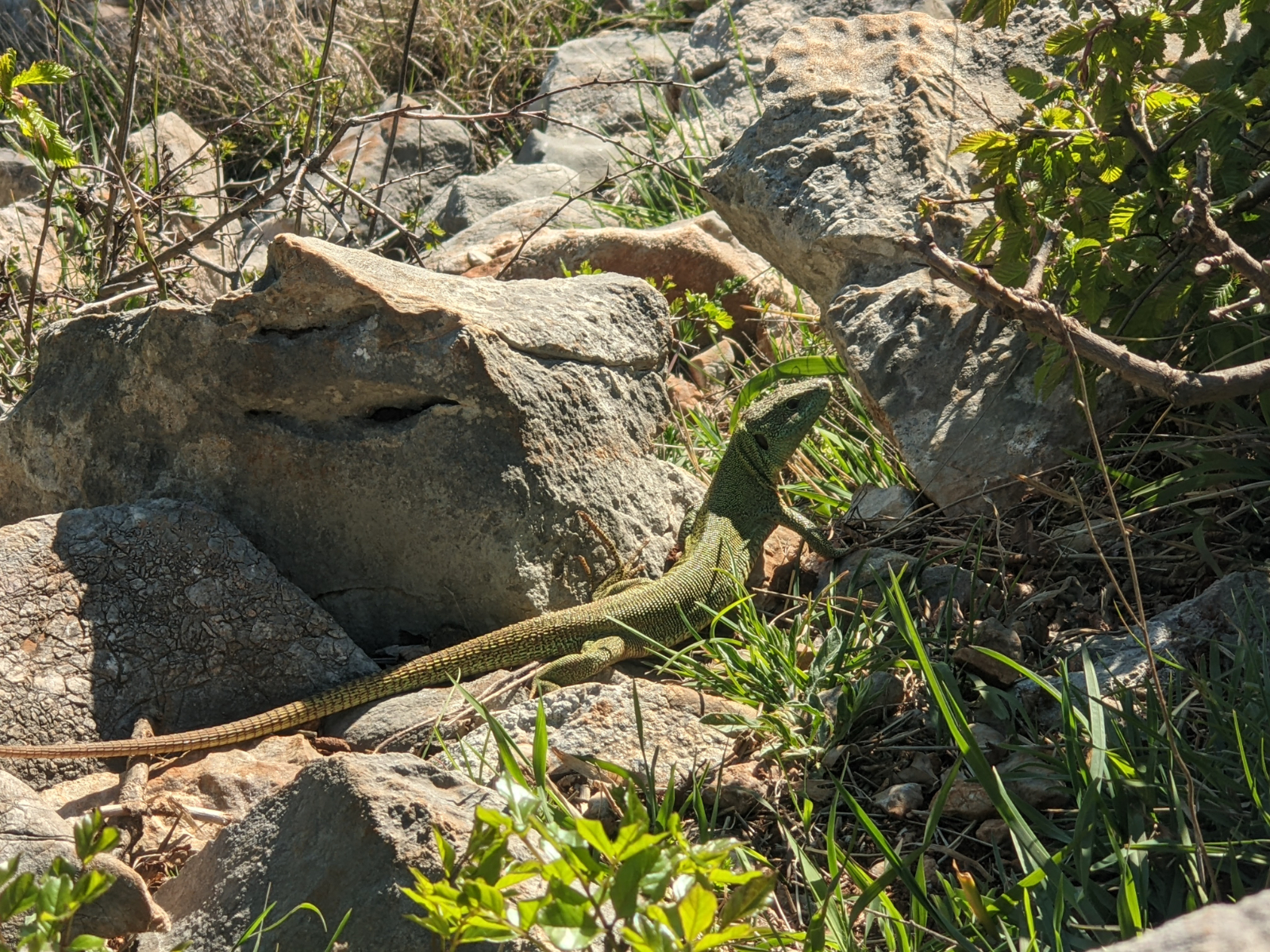Wir wanderten ein kleines Stück bergab, um auch die kleinen Wasserfälle unten bestaunen zu können. Auf dem Wanderweg nach unten, der wie überall in Kroatien sehr steinig war und in der prallen Sonne lag, begegnete uns das ein oder andere Getier. Ich kann euch nun mit Bestimmtheit sagen: Der gestrige Spruch mit der Schlange war kein Scherz! Heute habe ich mit eigenen Augen eine gesehen! Sie war deutlich größer als das gestrige Exemplar, wir schätzen ca. einen halben Meter. Gott sei Dank verzog sie sich recht schnell, nachdem wir sie entdeckt hatten. Schlangen gehören eindeutig nicht zu unseren Lieblingstieren! Da die Schlange so schnell wieder weg war, gibt es kein Fotobeweis. Allerdings sind uns heute auch noch andere Tiere begegnet.