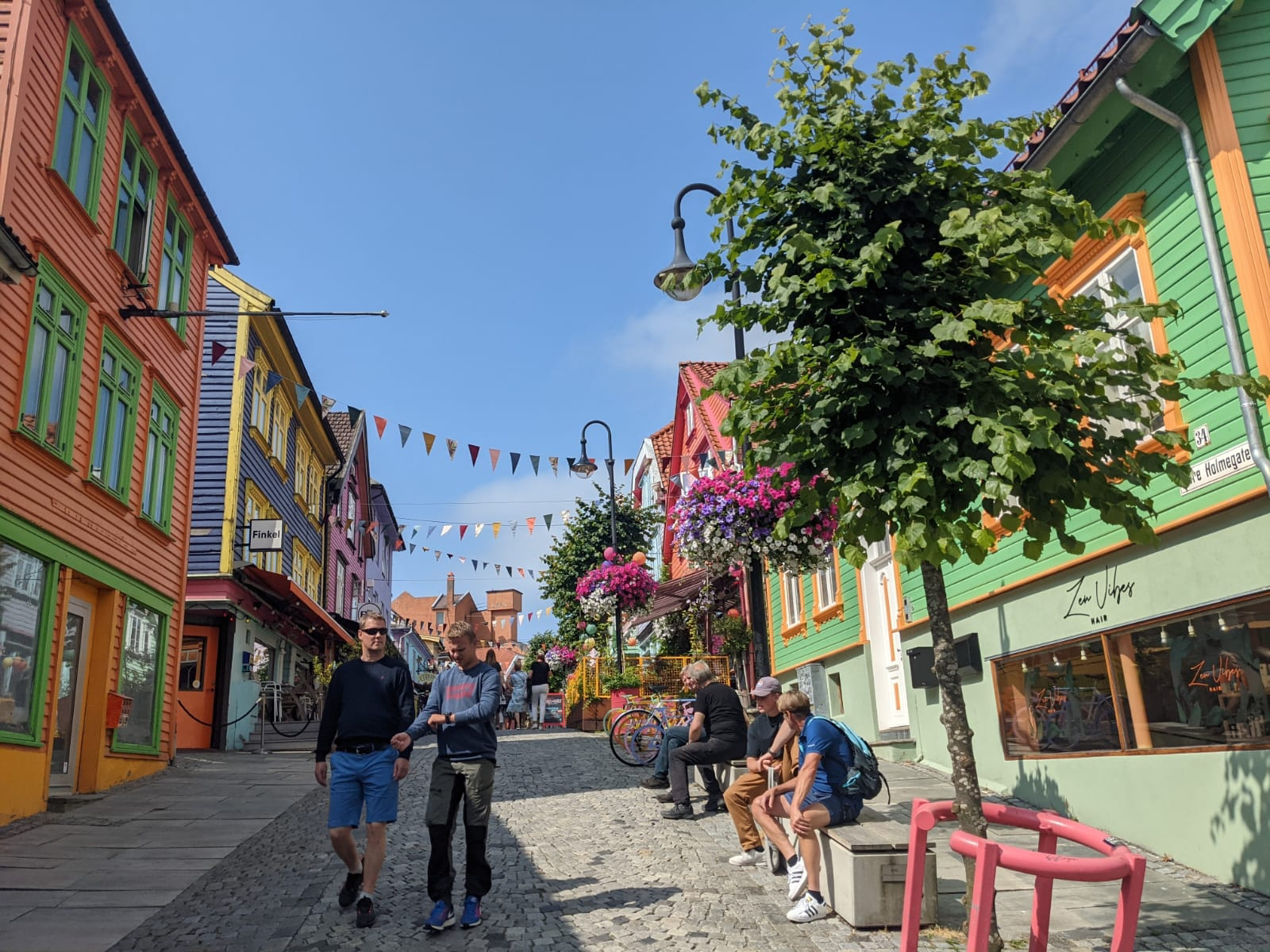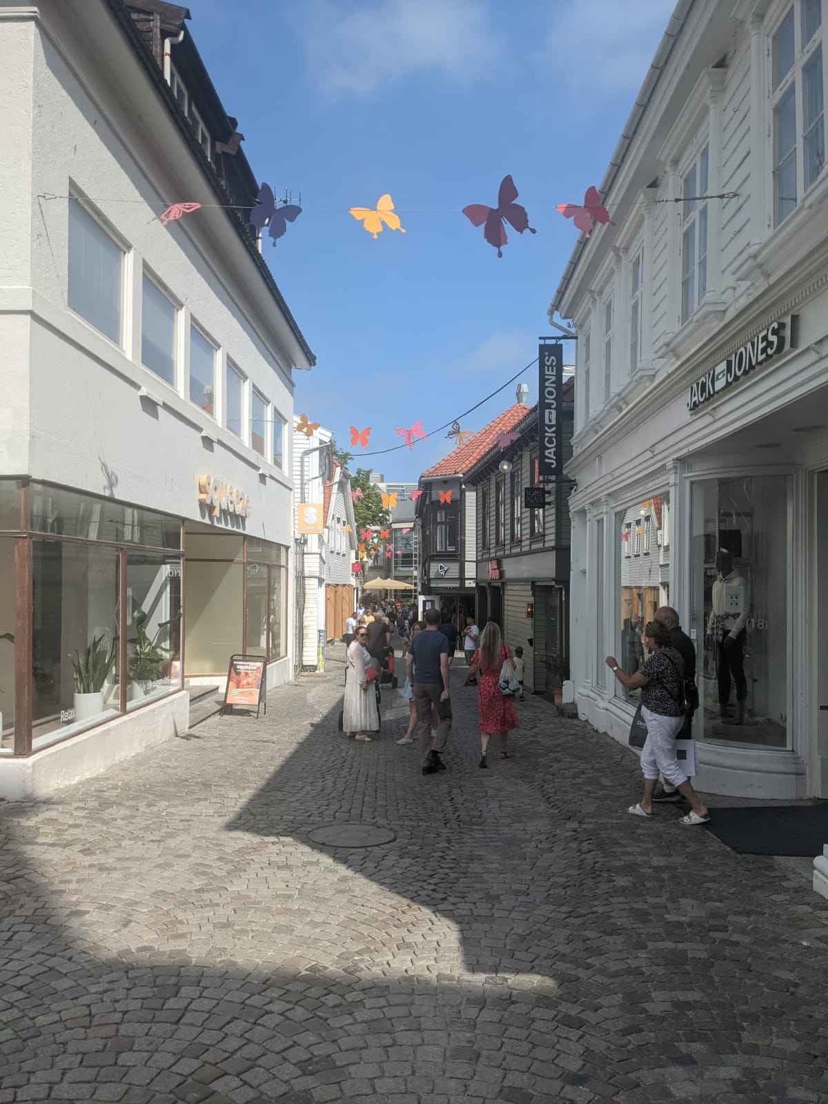 Erst gegen halb 11 setzten wir uns ins Auto. Die erste Strecke war nur kurz, etwa 30km bis zur nächsten Stadt „Stavanger“. Wir parkten zentrumsnah und schlenderten durch die Fußgängerzone. Stavanger gefiel uns gut. Die kleinen Gässchen waren teilweise sehr hübsch geschmückt.