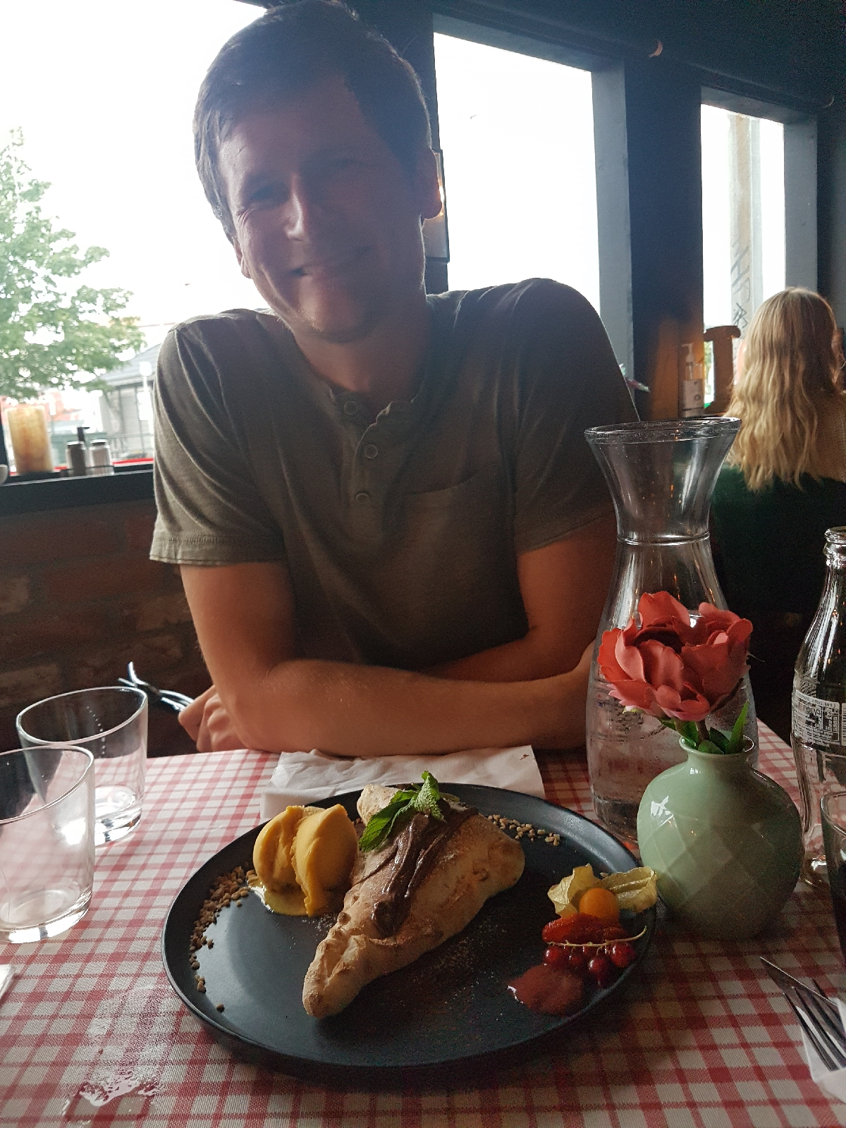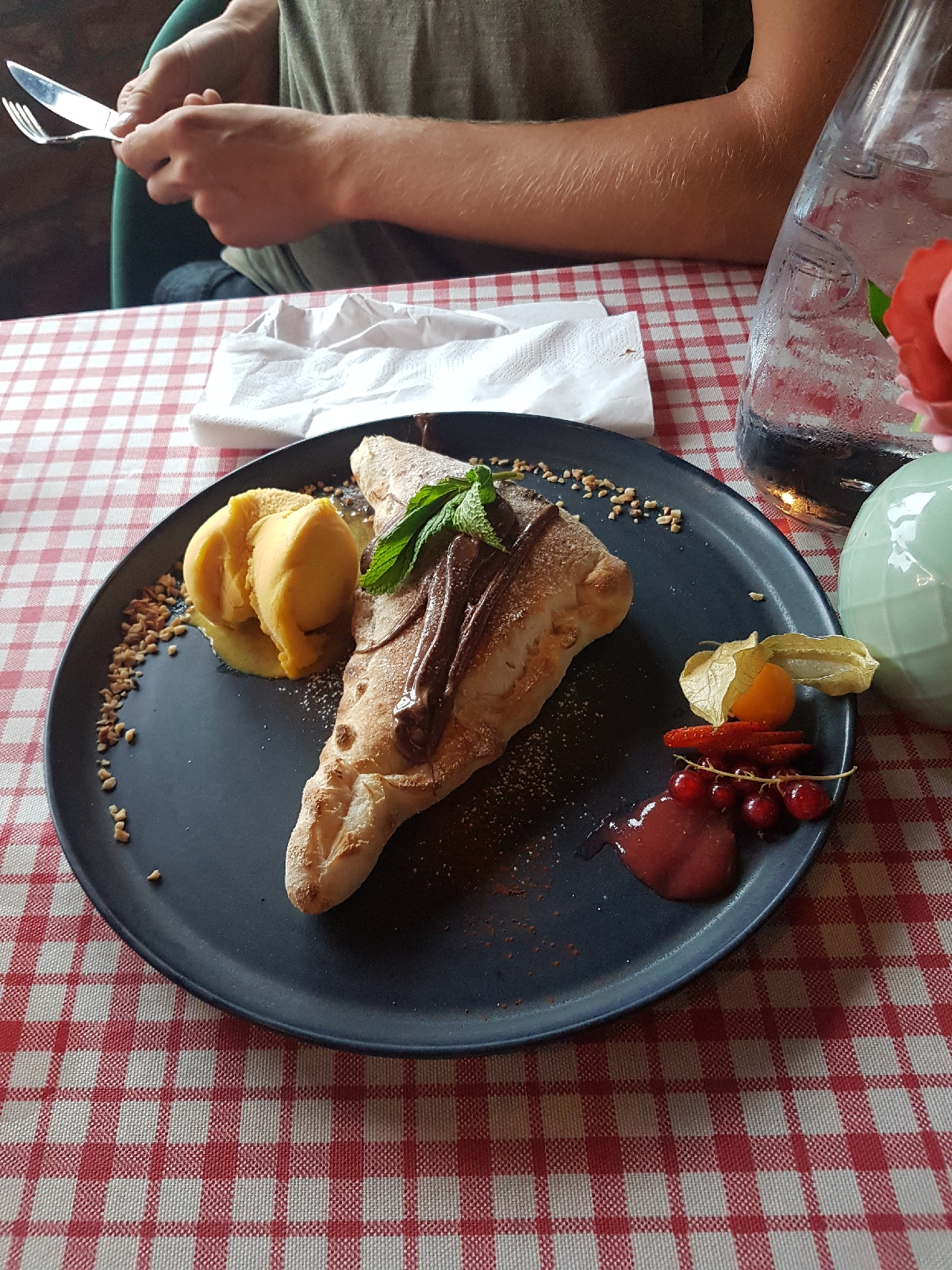 Nach dem kleinen Erkundungsspaziergang inklusive der Beobachtung einer 8-köpfigen Schwanfamilie suchten wir ein schönes Restaurant, um den Urlaub gemütlich ausklingen zu lassen. Wir landeten bei einem kleinen Italiener, bei dem wir sehr lecker zu Abend aßen! Das Highlight war das Dessert 😍 Nutella-Calzone! Dazu ein leckeres Mangosorbet… herrlich!