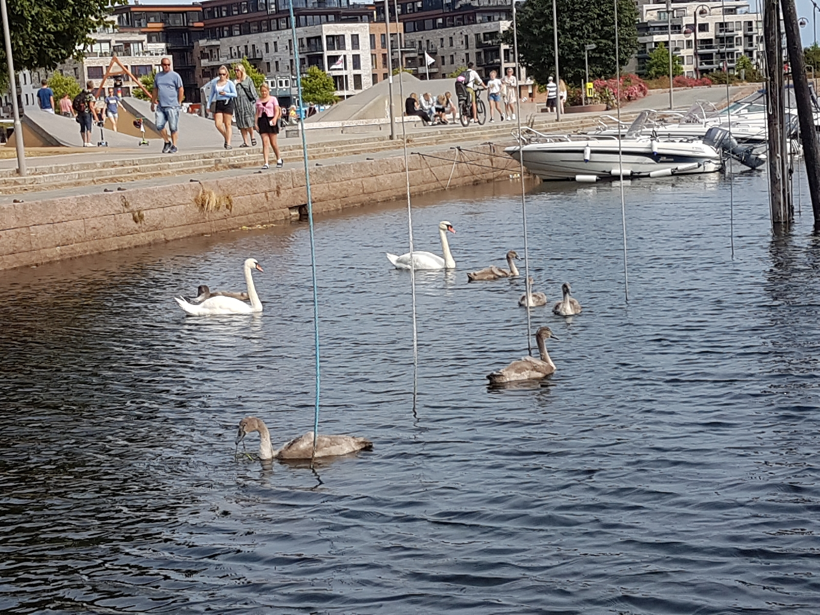 Gegen 16:30 Uhr kamen wir in der Stadt an und gingen ein bisschen am Wasser spazieren. Es gibt eine große und schön angelegte Promenade, die direkt am Wasser entlang führte. Es war viel los, die Menschen zog es bei dem Wetter auf die Grünanlagen und an den Strandbereich. Es war aber auch wirklich schön hier, gab viele Bewegungsangebote für Groß und Klein und schöne Sitzgelegenheiten.