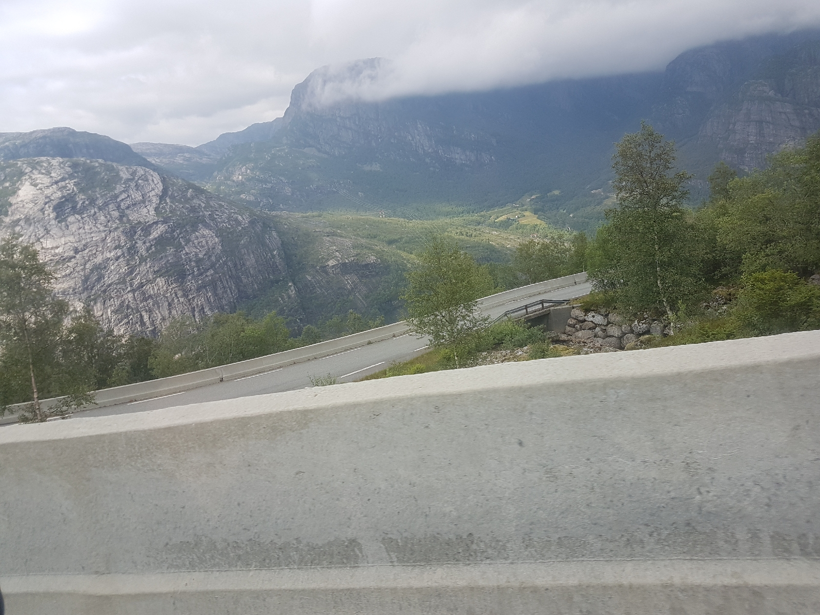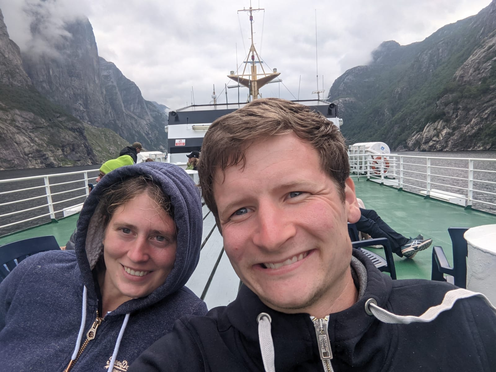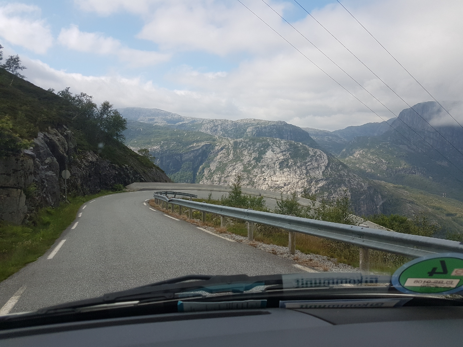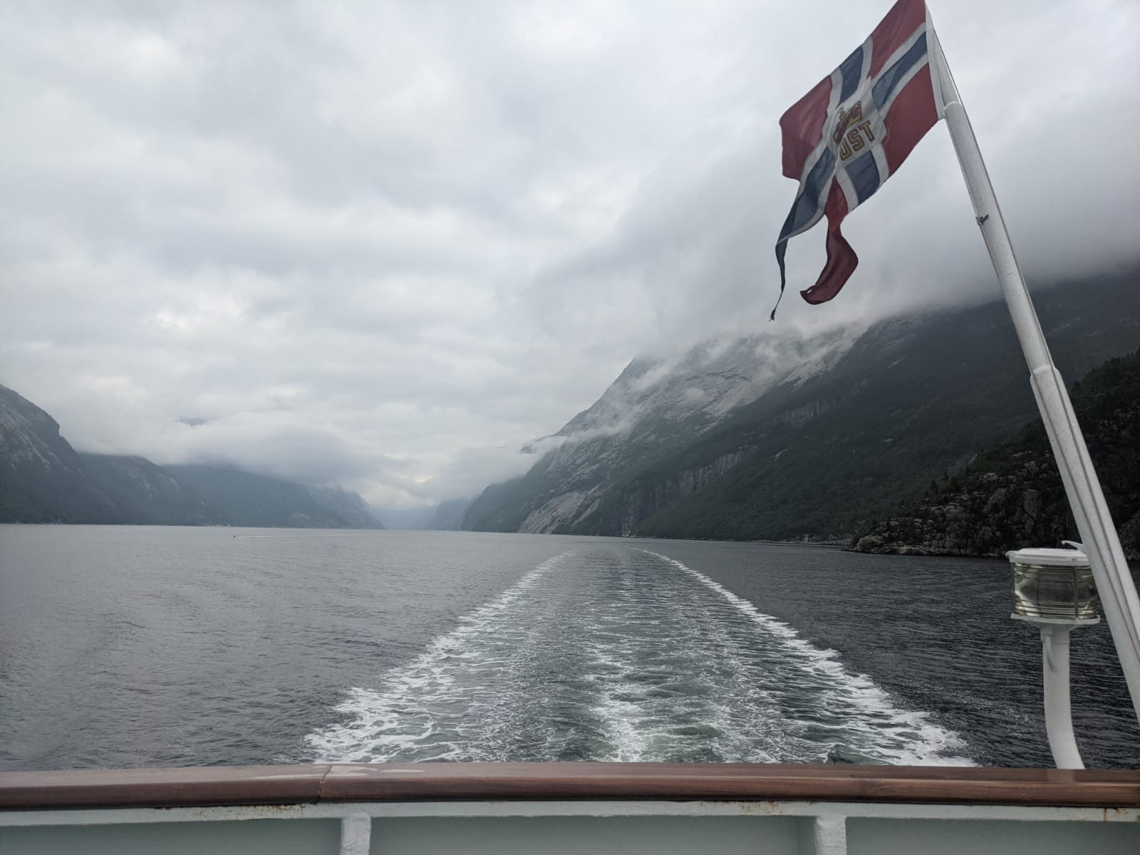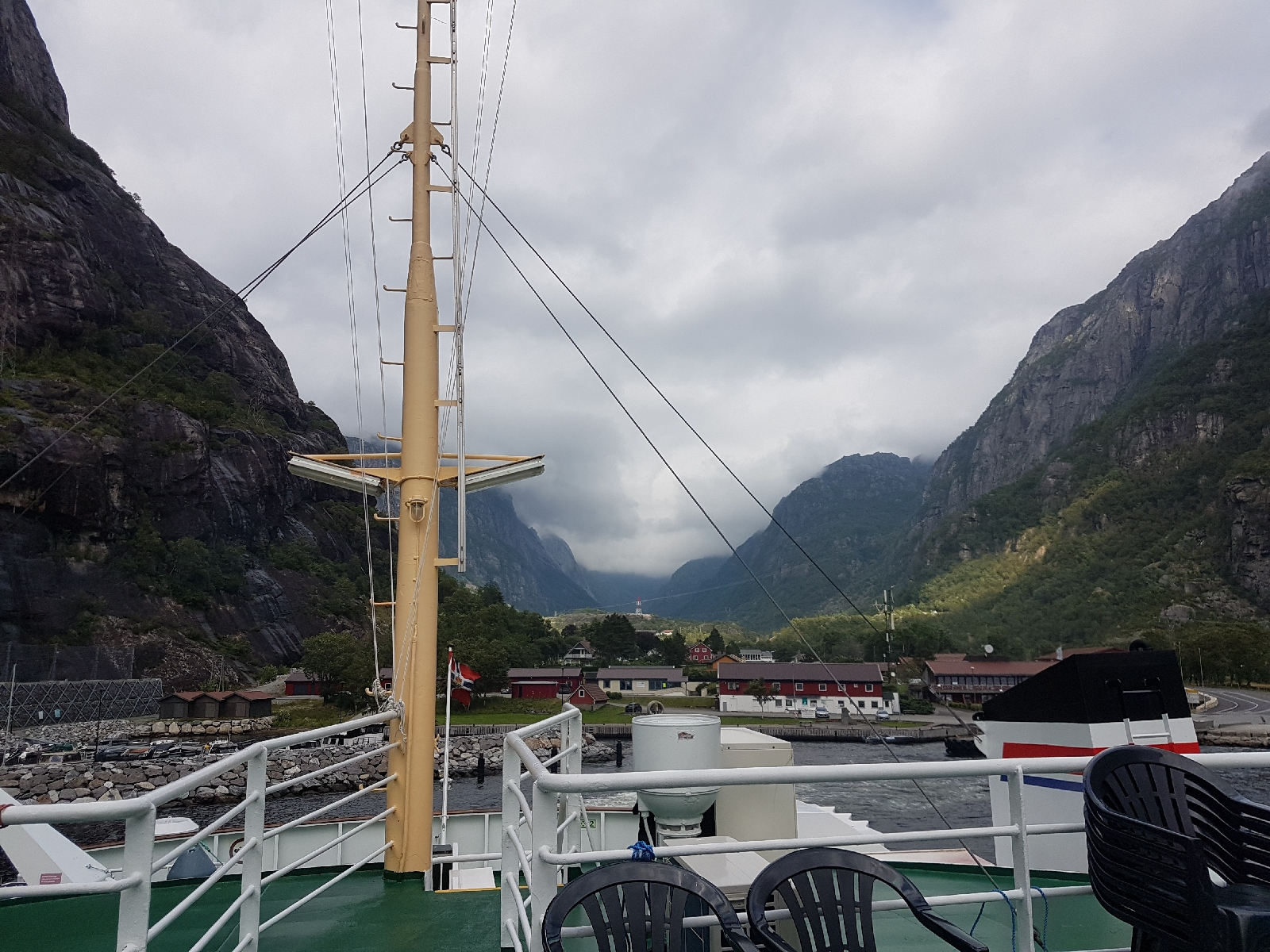 In Lysebotn angekommen, stellten wir fest dass es sich etwas zugezogen hatte. Dies hatten wir über den Wolken gar nicht bemerkt, der Sonnenbrand freut sich ünrigens. 🌞 Um 18 Uhr nahmen wir die Fähre durch den Lysefjord bis nach Foresand. Der Blick von der Fähre war toll, die Steilklippen mit den vielen Wasserfällen wunderschön und man könnte durch ein paar Wolken sogar den Kjeragbolten und den Preikestolen bewundern. Diesen werden wir uns morgen genauer ansehen. Nach kurzer Zeit entschieden wir uns dazu, die Fährfahrt drinnen zu verbringen. Draußen war es mit dem Wind und ohne Sonne inzwischen doch recht kühl geworden.