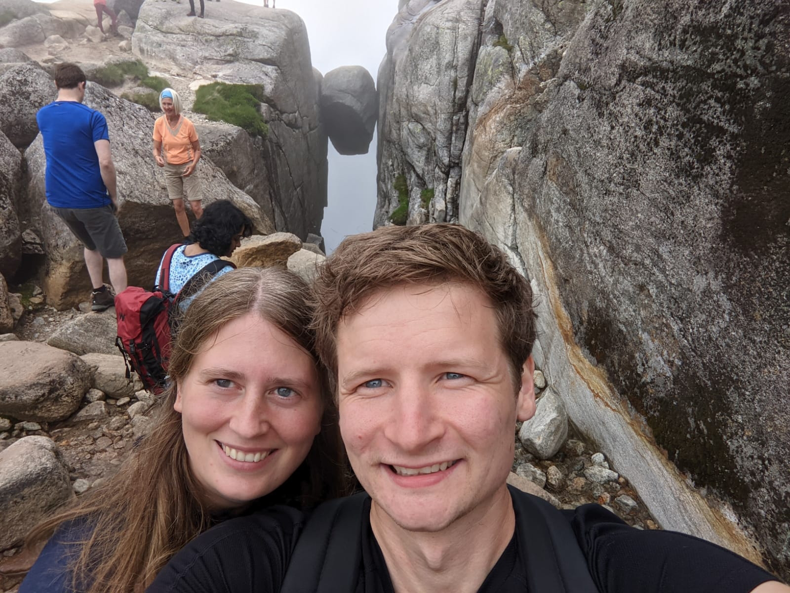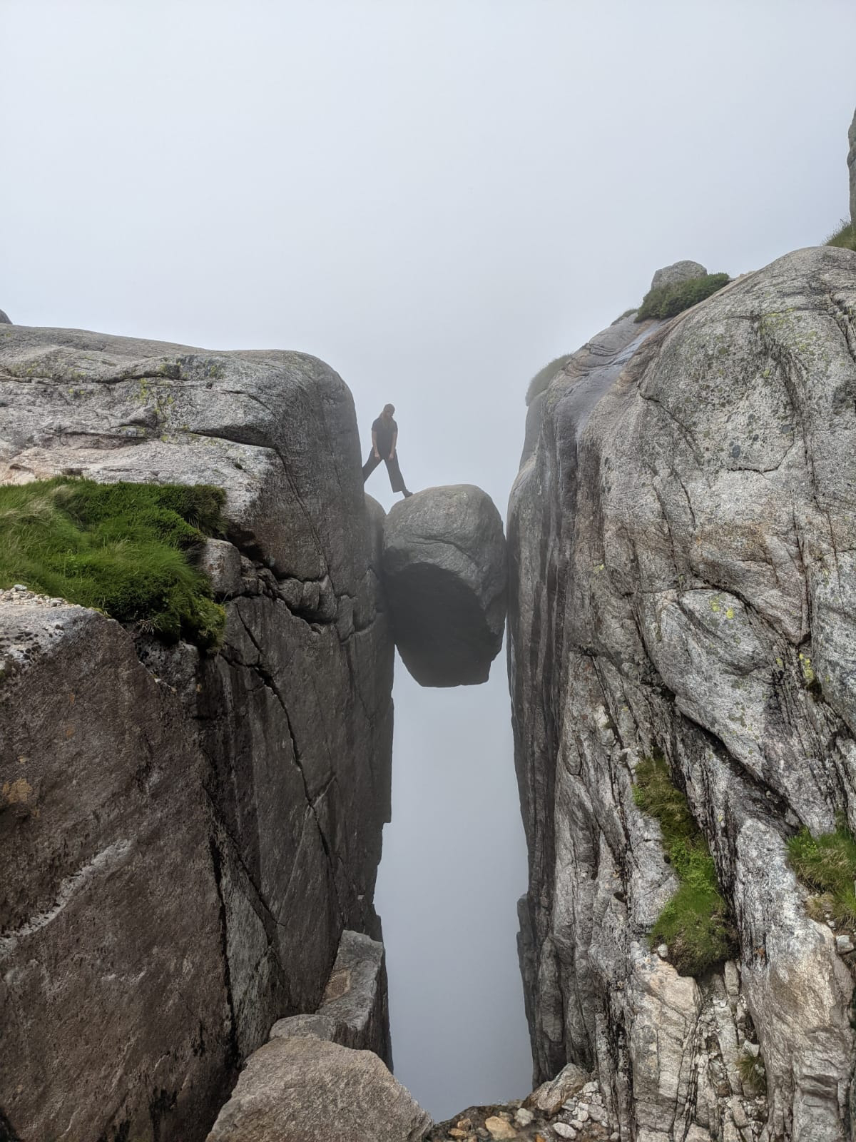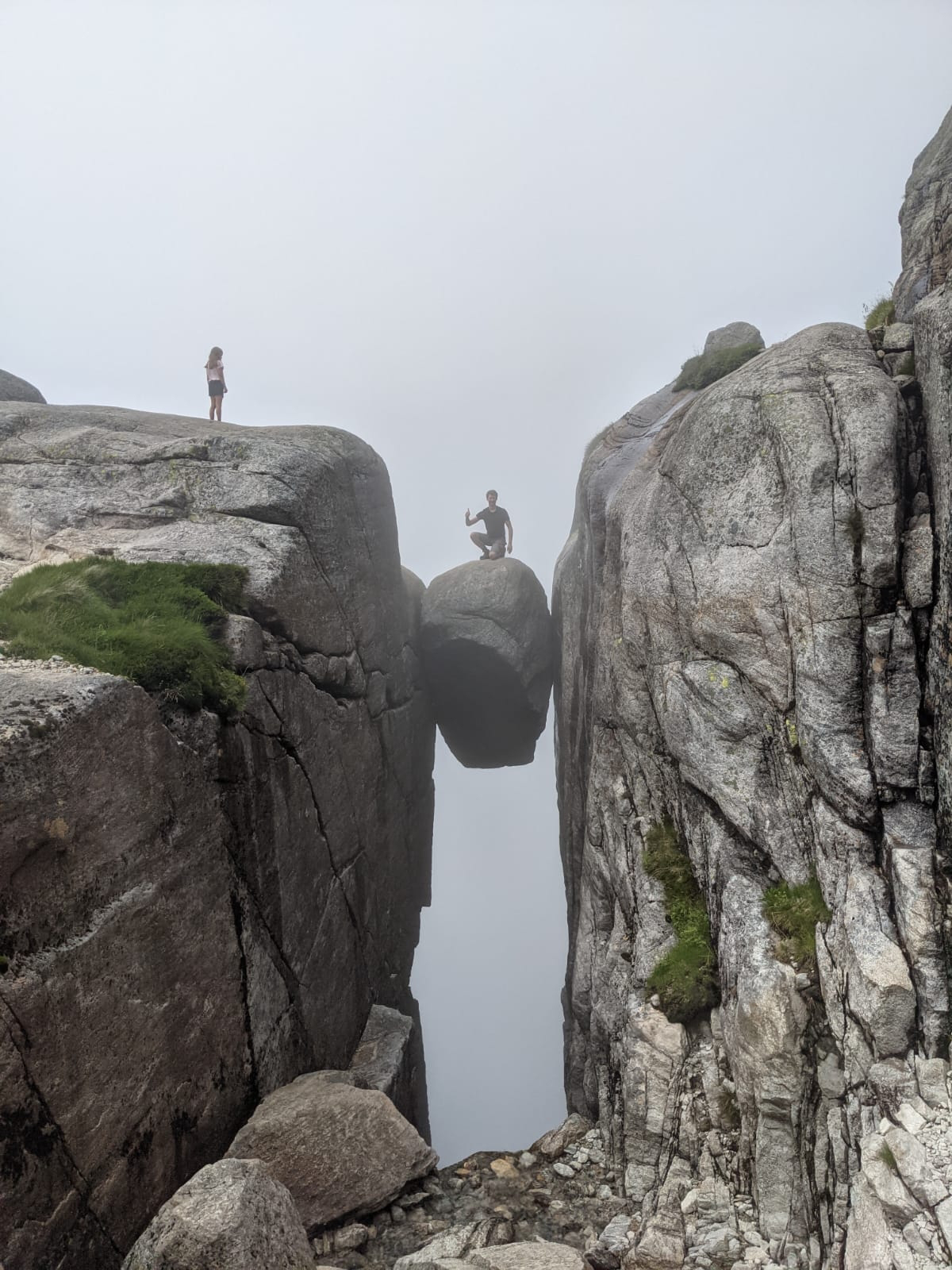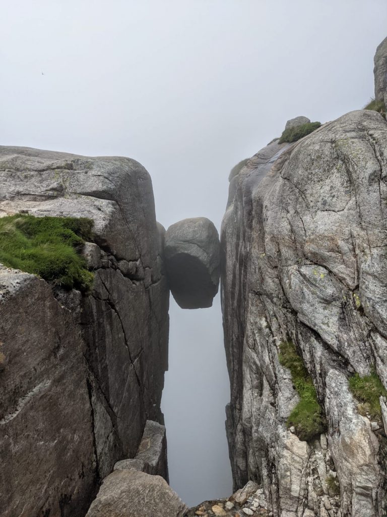 Es gab 3 Anstiege und dementsprechend 2 Abstiege bis wir an unserem Ziel ankamen. Der Kjeragbolten in ungefähr 1000 Metern Höhe! Wir kamen ganz schön ins Schwitzen. Bei Sven kam der Schweiß von der Anstrengung, bei mir war es zugegebenermaßen zum Teil auch Angstschweiß. 😅 Der Felsen war teilweise sehr glatt geschliffen, dazu noch nass vom Nebel und direkt neben mir ging es viele 100 Meter den Berg hinab. Wer kann mir meine Angst da verübeln? Bisher hätte ich behauptet ich sei höhenfest, inzwischen bin ich da nicht mehr so sicher. Aber ich wollte ja das Foto! So schwierig kann das doch nicht sein! Doch… kann es! Vor und hinter diesem (verdammt kleinen!!!) Felsbrocken geht es 1000 Meter in die Tiefe! Ohne Sicherung… ohne Seil zum Festhalten… ohne irgendeine Begrenzung… Ende vom Lied: Ich habe mich nicht getraut, diesen Schritt zu wagen. Sven war etwas mutiger, aber hinstellen war auch nicht drin.