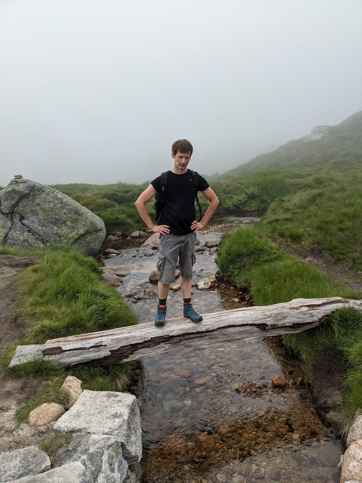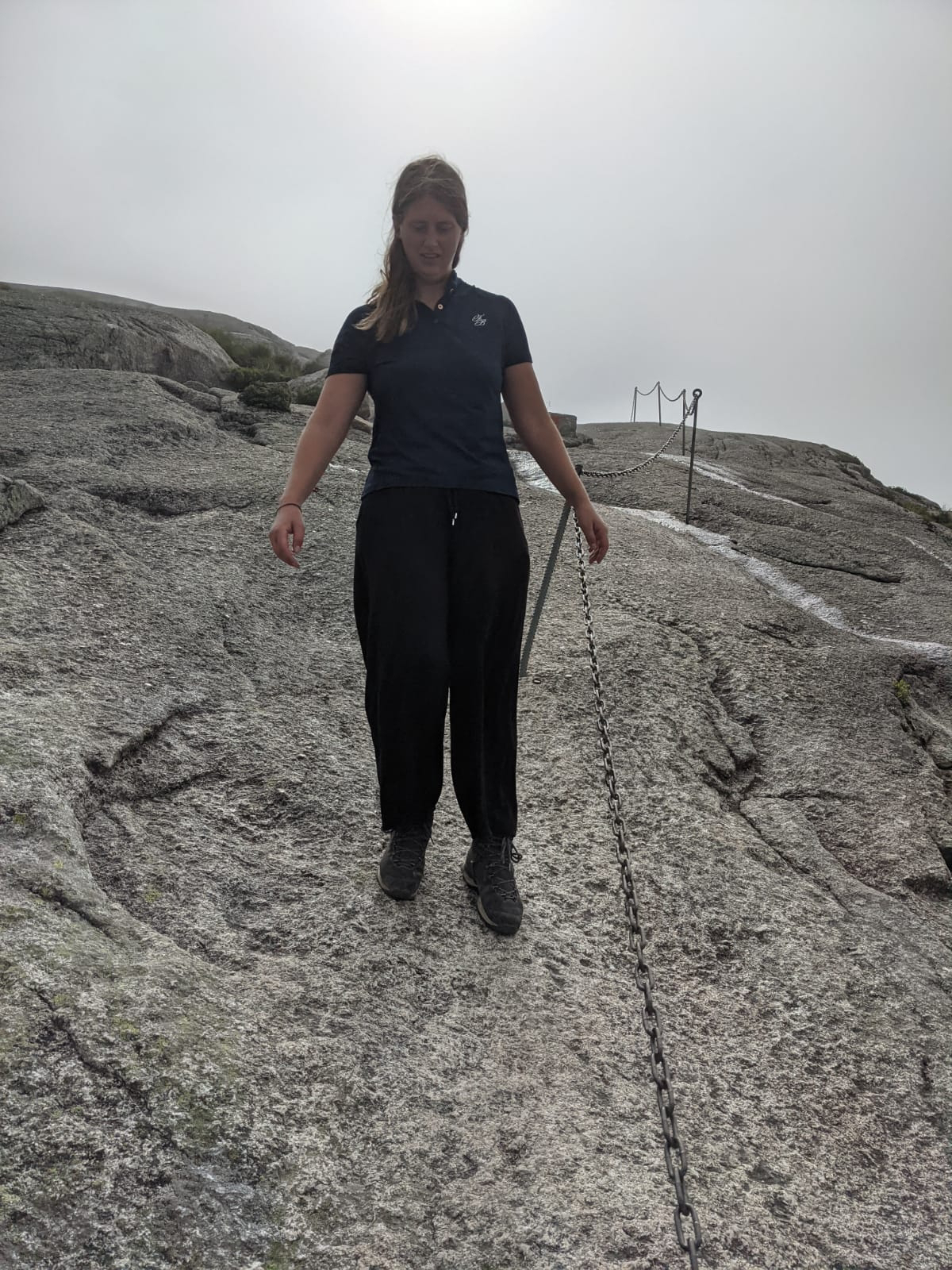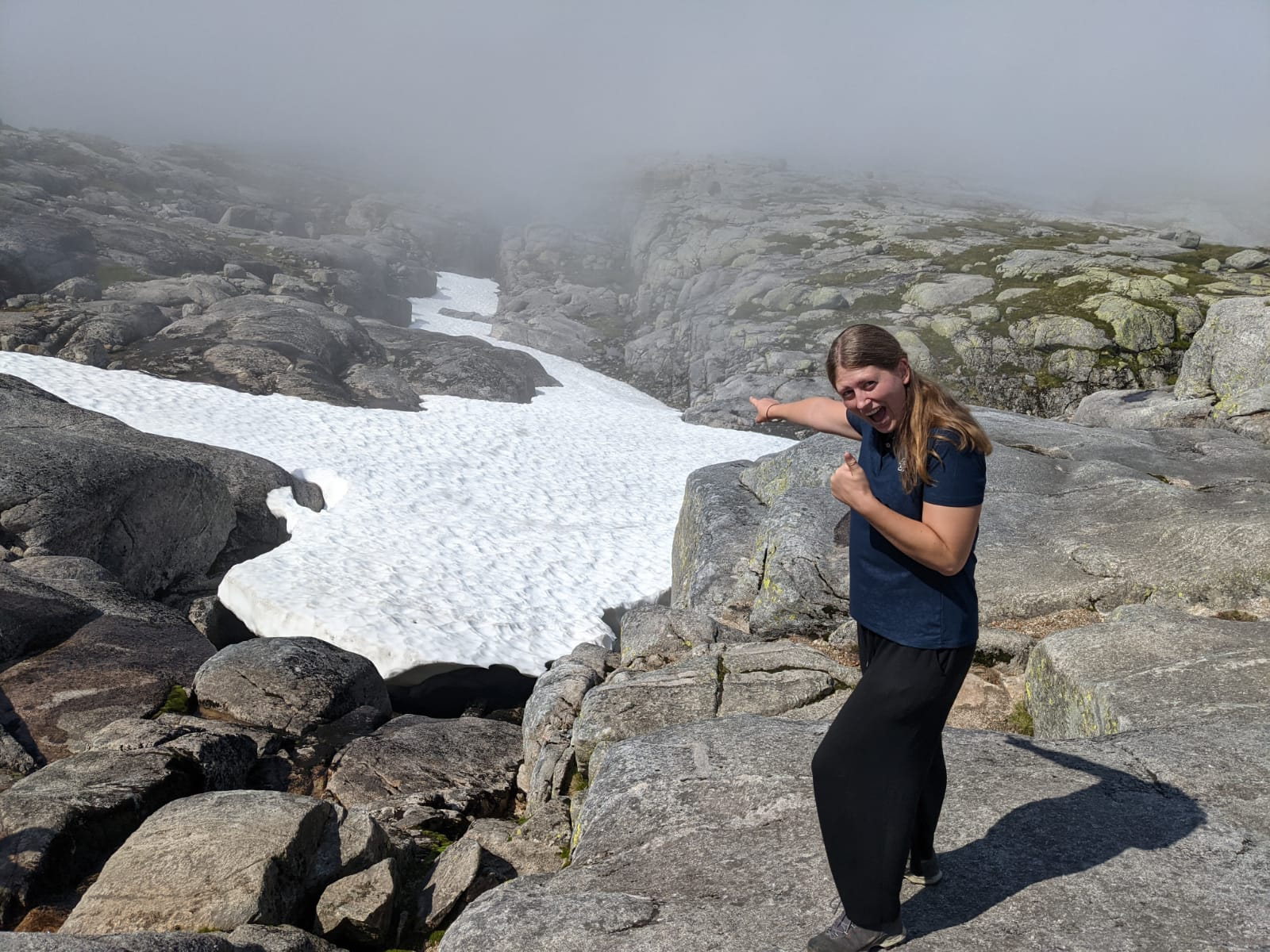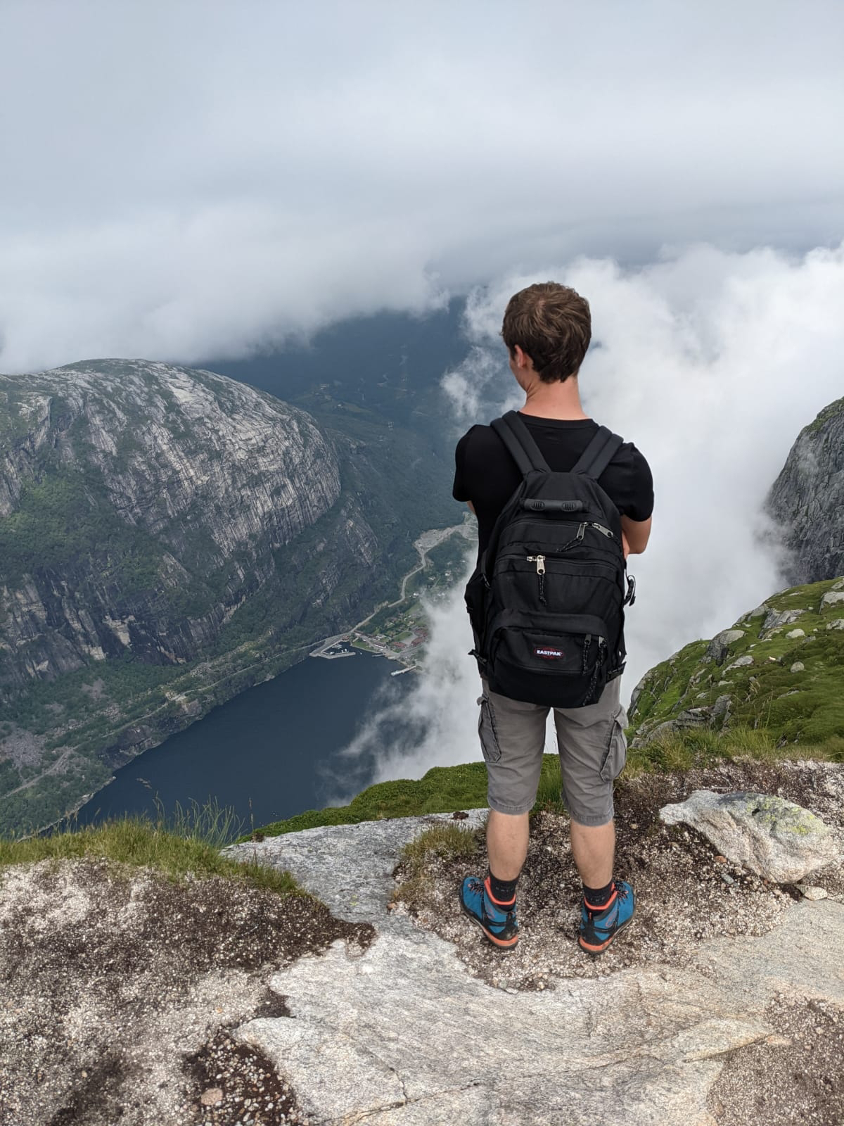 Es gab 3 Anstiege und dementsprechend 2 Abstiege bis wir an unserem Ziel ankamen. Der Kjeragbolten in ungefähr 1000 Metern Höhe! Wir kamen ganz schön ins Schwitzen. Bei Sven kam der Schweiß von der Anstrengung, bei mir war es zugegebenermaßen zum Teil auch Angstschweiß. 😅 Der Felsen war teilweise sehr glatt geschliffen, dazu noch nass vom Nebel und direkt neben mir ging es viele 100 Meter den Berg hinab. Wer kann mir meine Angst da verübeln? Bisher hätte ich behauptet ich sei höhenfest, inzwischen bin ich da nicht mehr so sicher. Aber ich wollte ja das Foto! So schwierig kann das doch nicht sein! Doch… kann es! Vor und hinter diesem (verdammt kleinen!!!) Felsbrocken geht es 1000 Meter in die Tiefe! Ohne Sicherung… ohne Seil zum Festhalten… ohne irgendeine Begrenzung… Ende vom Lied: Ich habe mich nicht getraut, diesen Schritt zu wagen. Sven war etwas mutiger, aber hinstellen war auch nicht drin.