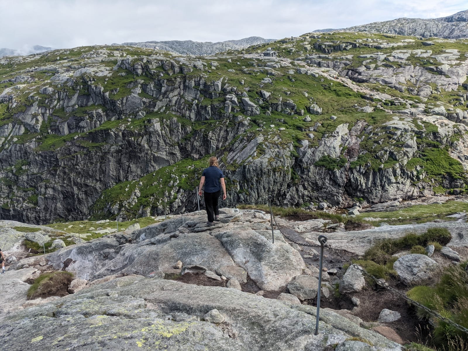 Basti hatte an den Steigungen ordentlich zu kämpfen, Sven musste sich mit dem Gegenverkehr arrangieren (Norweger fahren nicht langsam im Nebel um enge Kurven!) und ich war damit beschäftigt, meinen Magen zu beruhigen. So viele Kurven sind einfach nichts für mich. Auf ungefähr 600 Meter Höhe erreichten wir dann den Parkplatz Øygardstøl, von dem aus die Wanderung starten sollte. Während eines kleinen Frühstücks lasen wir einige Berichte im Internet… okay, es sollte wohl kein Spaziergang werden, es fiel das Adjektiv anspruchsvoll… aber wir waren trotzdem frohen Mutes als wir unsere Wanderstiefel (Gott sei Dank!!) anzogen. Ungefähr 5-6 Stunden, ungefähr 10km Länge, ungefähr 800 Höhenmeter hin und zurück. Klingt doch gut machbar. Nach ca. 100 Metern war ich da anderer Meinung. Ja, richtig gelesen! Meter! 100! Es ging direkt vom Parkplatz aus so steil bergauf, dass wir mehr an den Hilfsseilen hingen als auf unseren Füßen zu stehen. Meine größte Sorge war ab diesem Zeitpunkt: „Wie soll ich da wieder runter kommen?!“ Diese Frage stellte ich Sven nicht nur einmal, aber „Das sehen wir dann schon.“ kam meist als Antwort. Nun gut, wie es so ist, gewöhnte man sich ein bisschen an das Gelände und wurde etwas sicherer. Wir sahen Mönche (die müssen Kleber unter den Schuhen gehabt haben!), sahen Schnee 😍 und gar nicht so viele andere Menschen wie befürchtet.