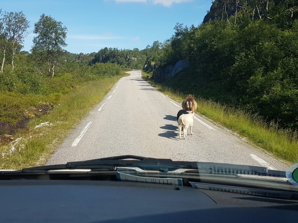 Und apropos Bild – mein Ziel für heute war es eindeutig, ein atemberaubendes Foto auf diesem Felsen zu erlangen. Sven wurden schon genaue Anweisungen gegeben, aber es sollte anders kommen… zunächst fuhren wir zu einem Parkplatz, von dem aus die Wanderung losgehen sollte. Auf dem Weg dorthin veränderte sich die Landschaft zusehend, es wurde kahler und schroffer je höher wir kamen. Dann ein Straßenschild… auf den nächsten 30km können freilaufende Schafe und Kühe unseren Weg kreuzen. Ja, richtig gelesen! Kilometer! 30! 🤣 Und ja… es waren Schafe unterwegs. Mehrmals.