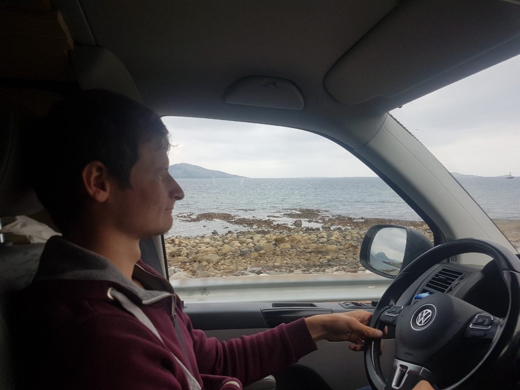 Naja, wir taten das als „warten auf die Fähre“ ab und stellten uns ganz entspannt hinten an. Es war ungefähr 10:45 Uhr. Wir warteten und warteten… alle vor und inzwischen auch hinter uns warteten… und irgendwann dachten wir uns schon, so ganz normal ist das vermutlich nicht. Irgendwann sahen wir weit vorne in der Schlange einen wichtig aussehenden Menschen mit Warnweste. Ungefähr gegen 12 Uhr kam er an unser Auto. Die Fähre sei kaputt, ein Schlepper sei unterwegs, gegen 13 Uhr hofft er, dass es weitergehen würde oder es zumindest neue Informationen gäbe. Nun gut, wir ließen uns die Laune nicht verderben. Wir hörten Harry, aßen Kekse und waren froh über Bastis gemütliches Dach überm Kopf! Draußen regnete es, es war stürmisch und ungemütlich. Lange Rede, kurzer Sinn… um 16 Uhr fuhren wir mit der Ersatzfähre los. Über 5 Stunden kamen wir 0 km voran! Er lief super, unser Tag zum Kilometerreißen! 😂