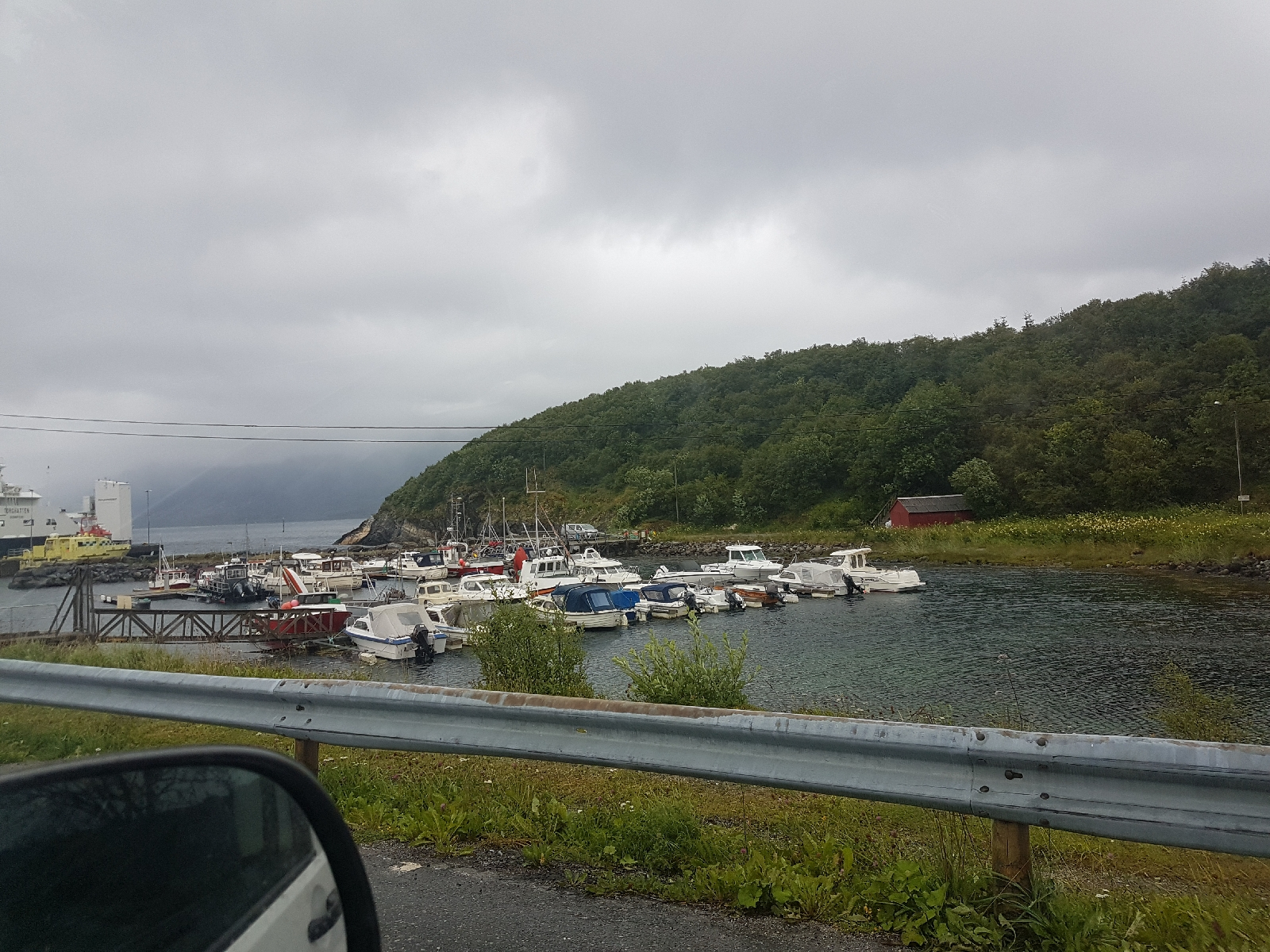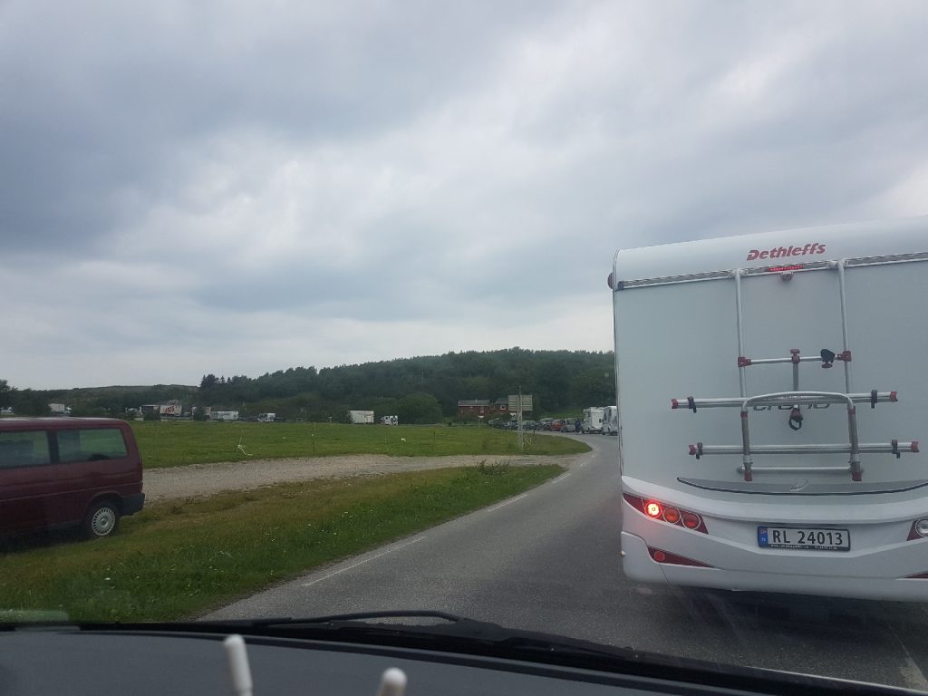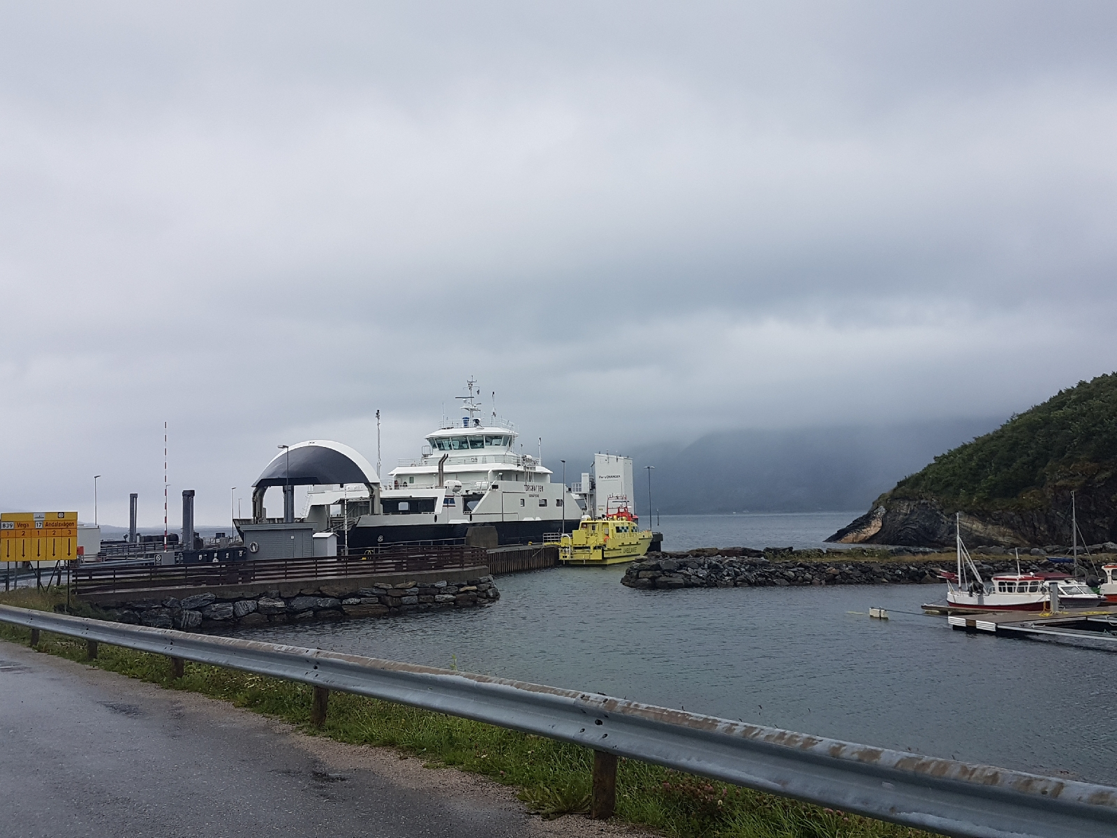 Es war die Nacht über wunderbar still gewesen, wir hatten keinen Funken Zivilisation bemerkt. Dementsprechend gut hatten wir geschlafen, waren früh wach und machten uns bereits um kurz nach 8 Uhr auf den Weg. Heute war wieder ein Tag, an dem wir uns vornahmen, möglichst viele Kilometer hinter uns zu bringen. Das Ziel Lofoten rückte schließlich langsam in greifbare Nähe. Harry Potter machte uns die Fahrt schmackhaft, wir konnten uns über Umbridge aufregen und so verging die Zeit ganz gut. Gegen 10 Uhr machten wir kurz Halt an einem Supermarkt und fuhren dann die erste Fähre des Tages an. Heute sollte es eine Landschaftsroute an der Küste entlang gehen und dementsprechend viele Fähren lagen auf dem Weg. Inzwischen hatten wir uns auch daran gewöhnt, dass die meisten Fähren wohl über die Maut bezahlt werden und wunderten uns nicht mehr über fehlende Zahlungsinformationen. 😅 Die erste Fähre nährte sich also, aber bevor wir in Sichtweite kamen, plötzlich Stau! Das hatten wir in Norwegen noch nie erlebt.