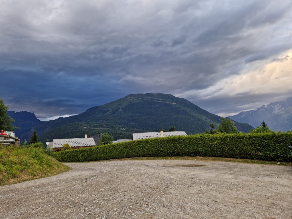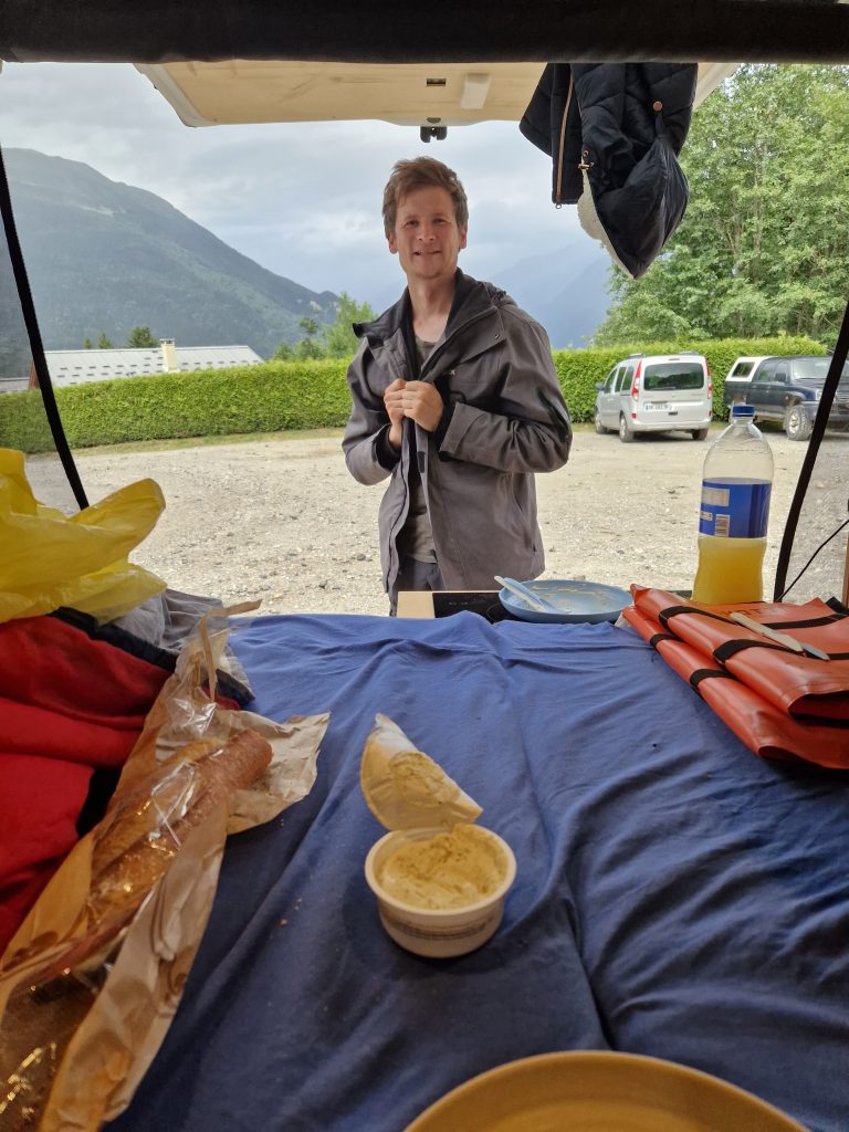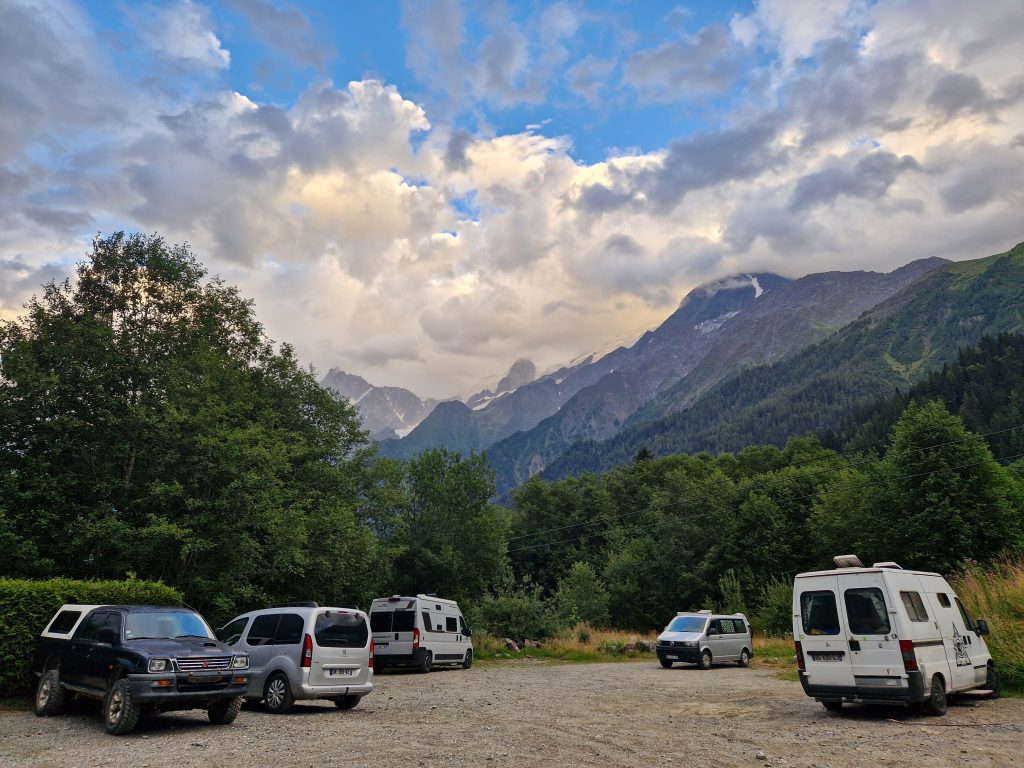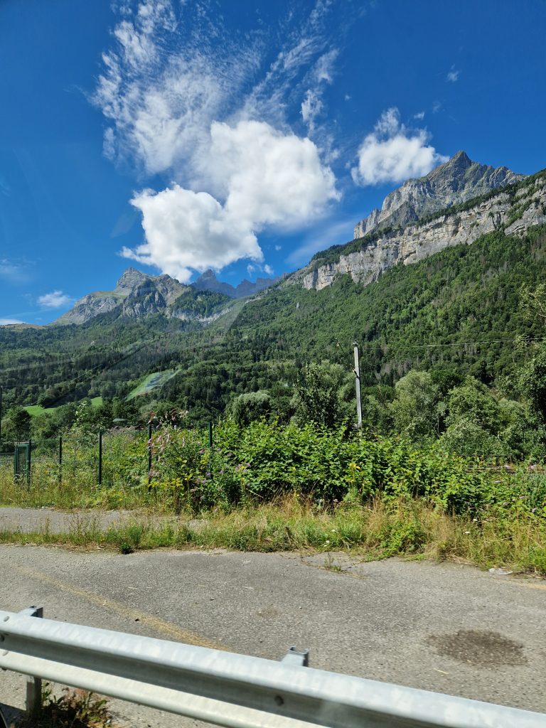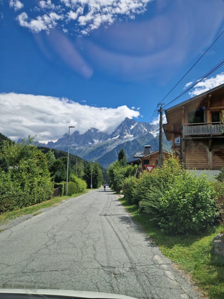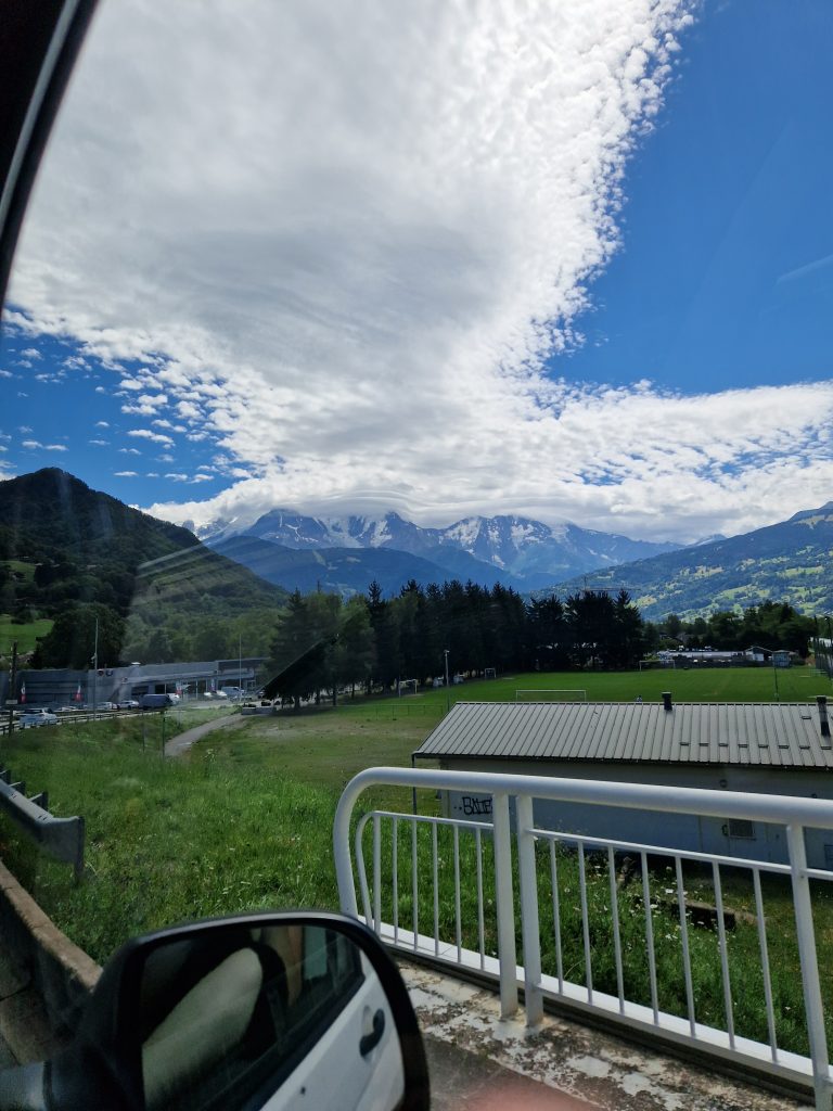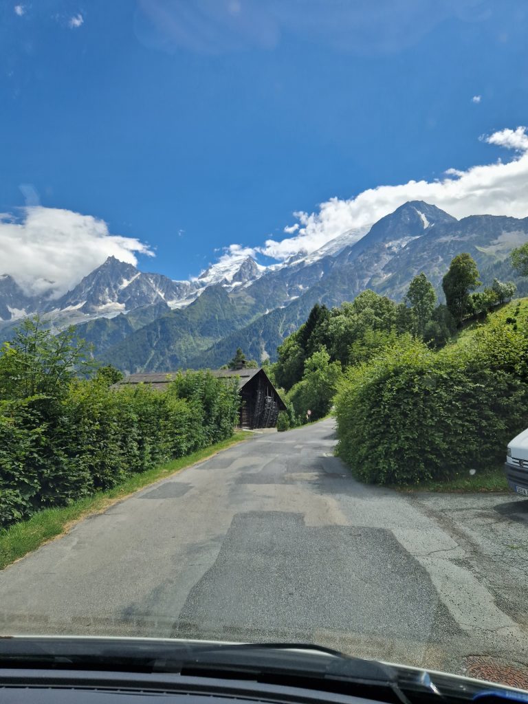 Die Straße führte zwar wunderschön durch die Berge, aber auch immer wieder durch kleine Ortschaften. Einmal machten wir Halt, um nochmal ein bisschen etwas einzukaufen. Wir hatten unseren Spülschwamm vergessen und da wir heute Abend grillen wollten, macht ein richtiger Schwamm schon Sinn 😅 Danach ging es weiter Richtung Mont Blanc. Irgendwann konnten wir den großen Riesen durch die Autofenster erkennen. Es war auffällig, dass der Mont Blanc, der immerhin über 4000 Meter hoch ist, in den Wolken hing, obwohl eigentlich ganz gutes Wetter war.