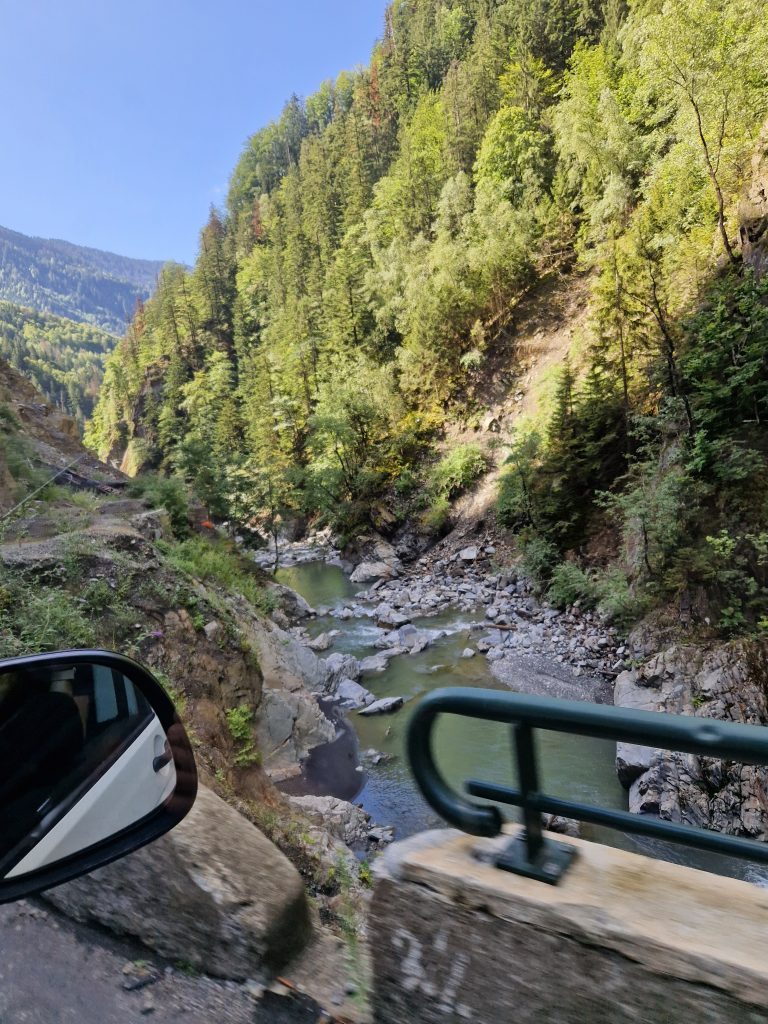 Tendenziell wird die Umgebung südländischer. Die kleinen Dörfer, durch die wir fahren, erinnern uns an unsere Urlaube in Kroatien und Italien. Nur die Olivenbäume fehlen noch.. Die Landschaft wird immer bergiger, häufig führt unsere Straße an kleinen und größeren Bächen und Flüssen entlang. Berge und Wasser – genau, wie wir es mögen!