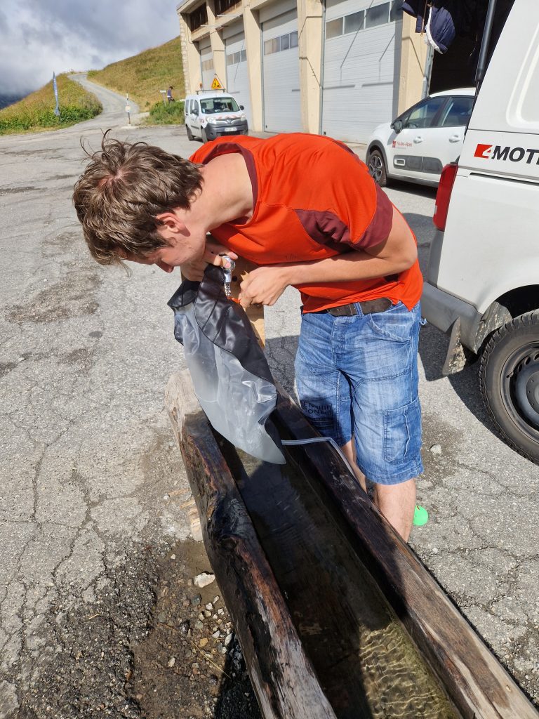 Jetzt könnte man sich fragen.. Huch? Warum ist die Dusche leer? Wurde etwa vom ersten Duschversuch gar nicht berichtet? Aber, nein! Es gab noch keinen ersten Duschversuch… die 20 Liter Wasser, die wir von zu Hause mitgebracht hatten, sind uns auf dem Campingplatz im Stubaital ausgelaufen 😂 Gott sei Dank stand Basti „richtig herum“ am Berg, sodass das Wasser einfach hinten aus dem Kofferraum rauslaufen konnte und nur der Boden etwas nass war. Der Schlauch hatte sich wohl irgendwie gelöst und somit war der Duschsack undicht. Nunja, nun folgt also Versuch Nummer 2. 🤷♀️