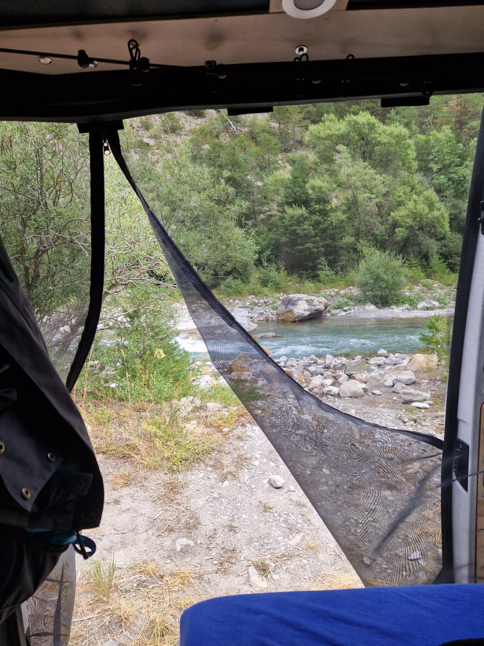 Zum Glück ist nicht mehr passiert, Basti fährt und wir sind heile wieder unten angekommen. Dann ging es auf Schlafplatzsuche und wir haben ganz in der Nähe eines wunderschönes Fleckchen Erde gefunden. Zwischen den Bergen stehen wir direkt am Fluss. Außer ein paar Anglern haben wir in den letzten Stunden niemanden gesehen oder gehört. Nur das Wasser hört man kontinuierlich entlang fließen. Wir genießen jetzt hier noch die Ruhe, essen zu Abend und lassen den Tag ausklingen. Morgen geht es weiter Richtung Küste, vielleicht fahren wir sogar durch bis Nizza. Mal schauen, auf was wir morgen Lust haben und wie das Wetter mitspielt.