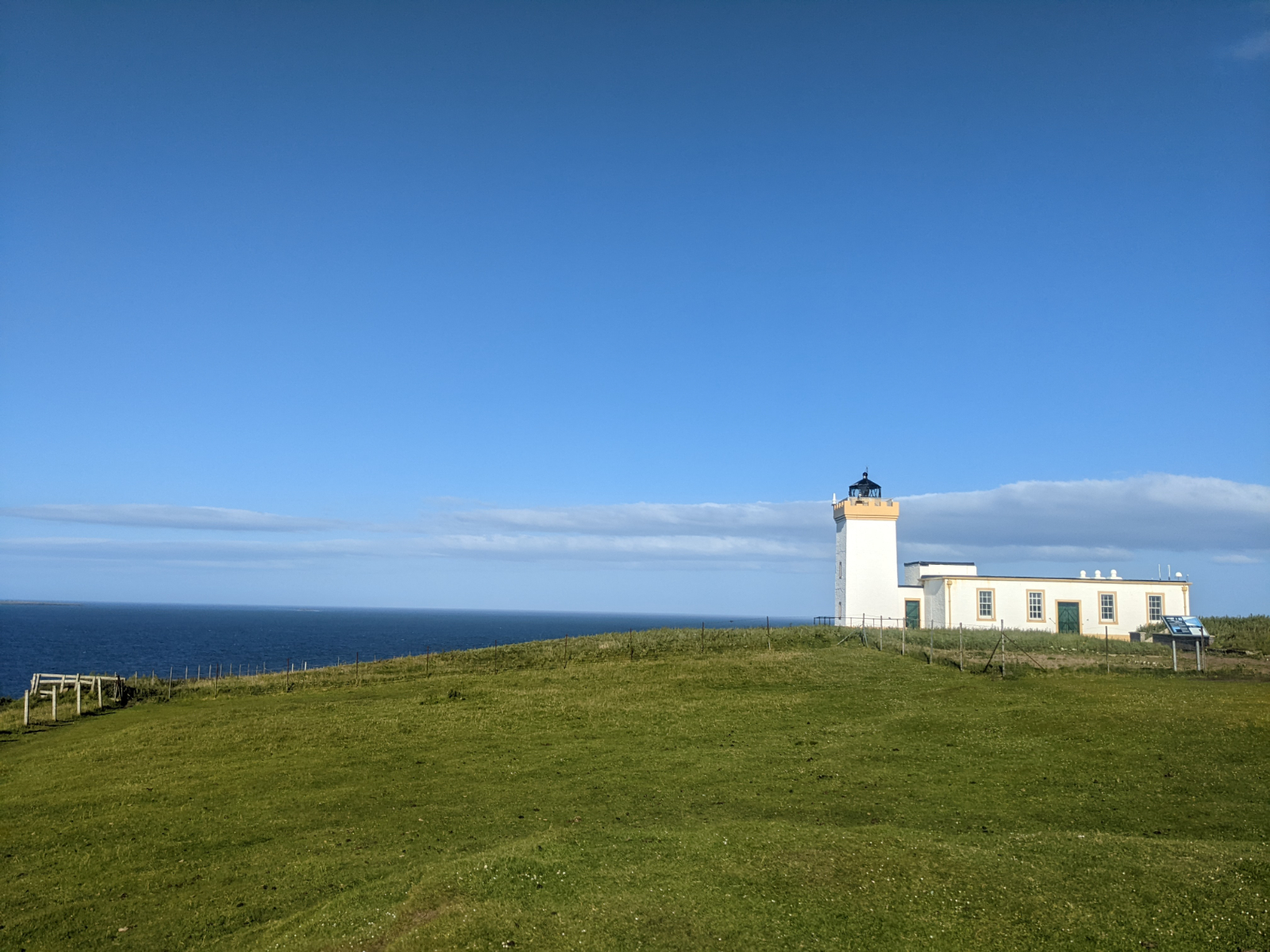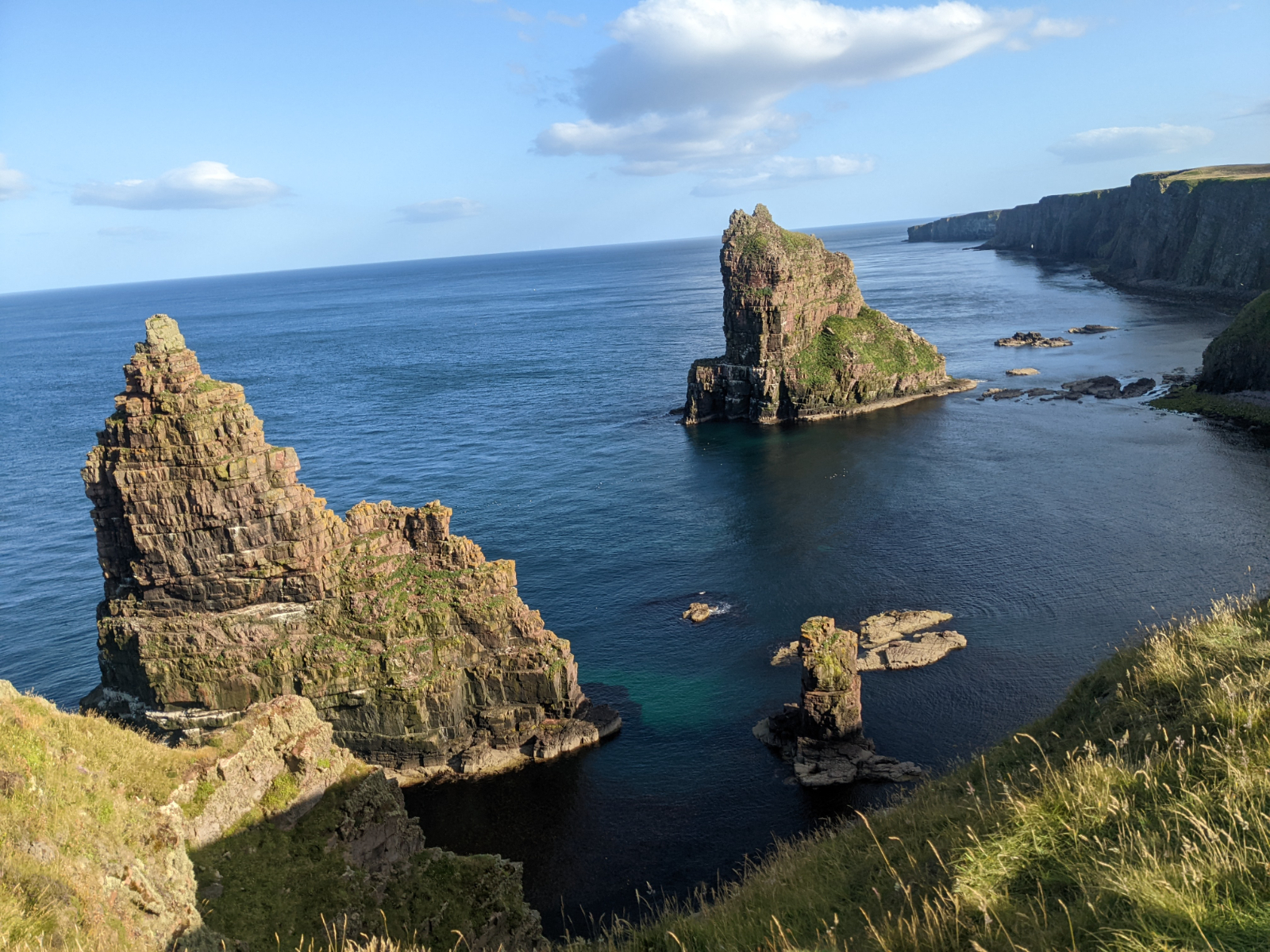Wir haben also den Tag über gefaulenzt. Sven fühlte sich besser als am Tag zuvor (und nein, er war nicht krank, er war nur nicht so fit wie sonst manchmal 😅) und trotzdem war uns ein Tag nach Nichtstun zumute. Erst gegen 16 Uhr sind wir weiter Richtung Norden gefahren. Wir haben den Leuchtturm in Duncansby Head angesteuert und dort geparkt. Anschließend sind wir dem Wanderweg an den Klippen gefolgt und bis Duncansby Stacks gelaufen. Das war zwar nicht weit, aber teilweise recht steil und es dauerte seine Zeit, wenn man die Ausblicke genießen möchte. Wir hatten extra unser Fernglas eingepackt, da die Gegend bekannt für ihre Tierwelt ist. Insbesondere für die dort brütenden Vögel, die sich in die kleinsten Felsvorsprünge gesetzt haben. Wir haben leider weder Robben noch Delfine gesichtet. Dafür hatten wir gedacht, dass wir tatsächlich Pinguine zu Gesicht bekommen hätten… 😅 Fehlalarm! Wir hatten bereits vor Ort diskutiert, ob das überhaupt möglich sei… und nein, Pinguine leben wohl nur auf der Südhalbkugel. Wir haben vermutlich Trottellummen durchs Fernglas erspäht. Die sehen Pinguinen von Weitem tatsächlich sehr ähnlich und es saß (stand) eine ganze Gruppe auf den Felsen im Meer.