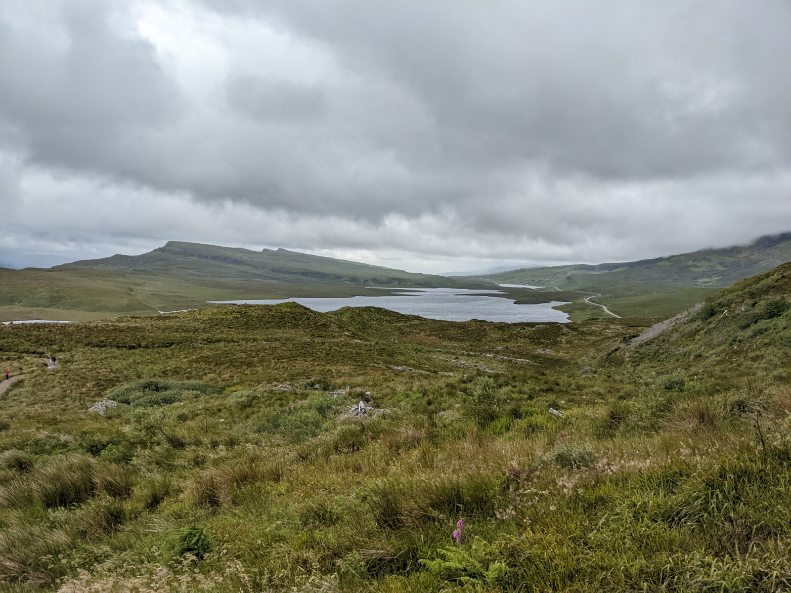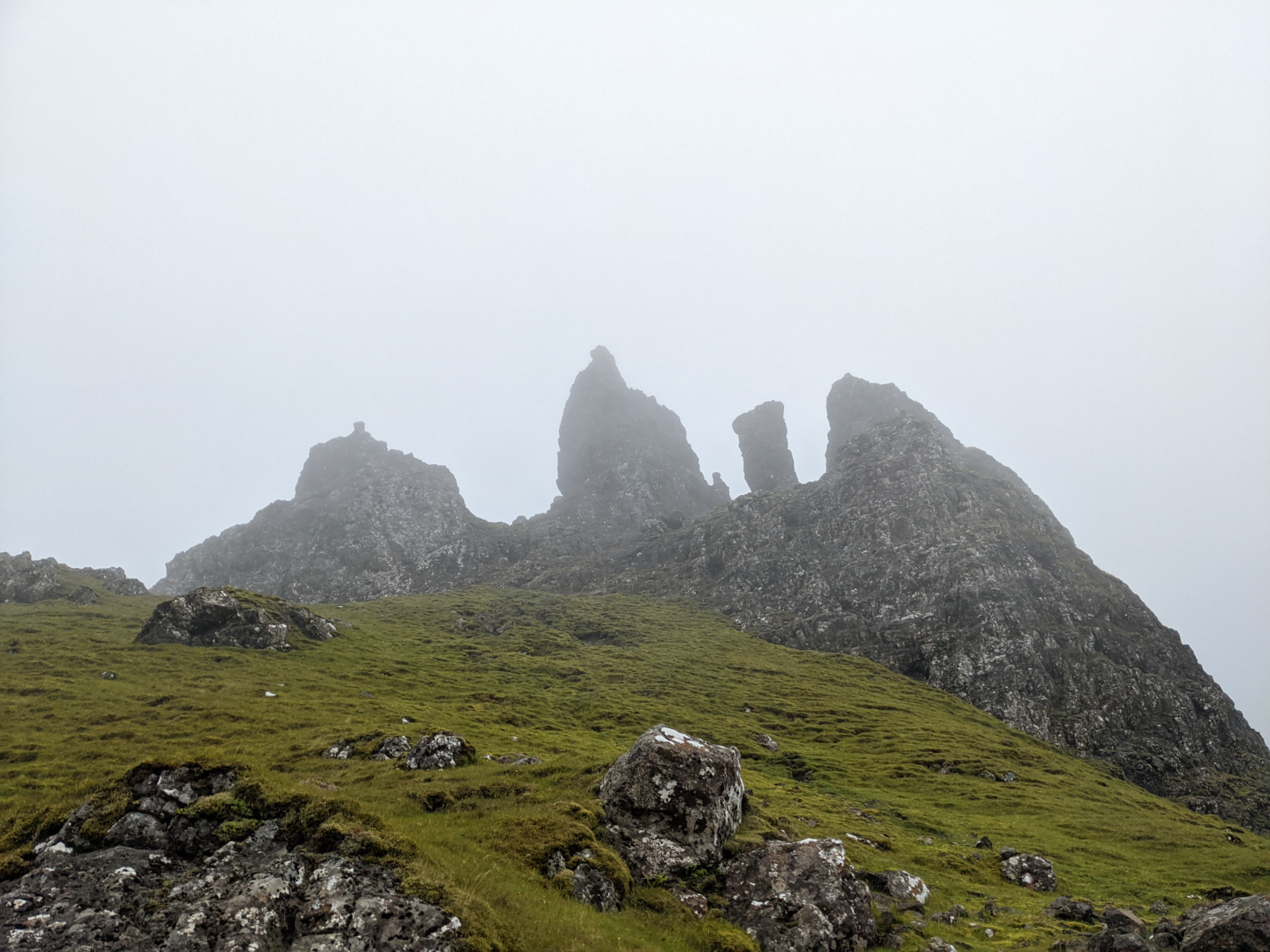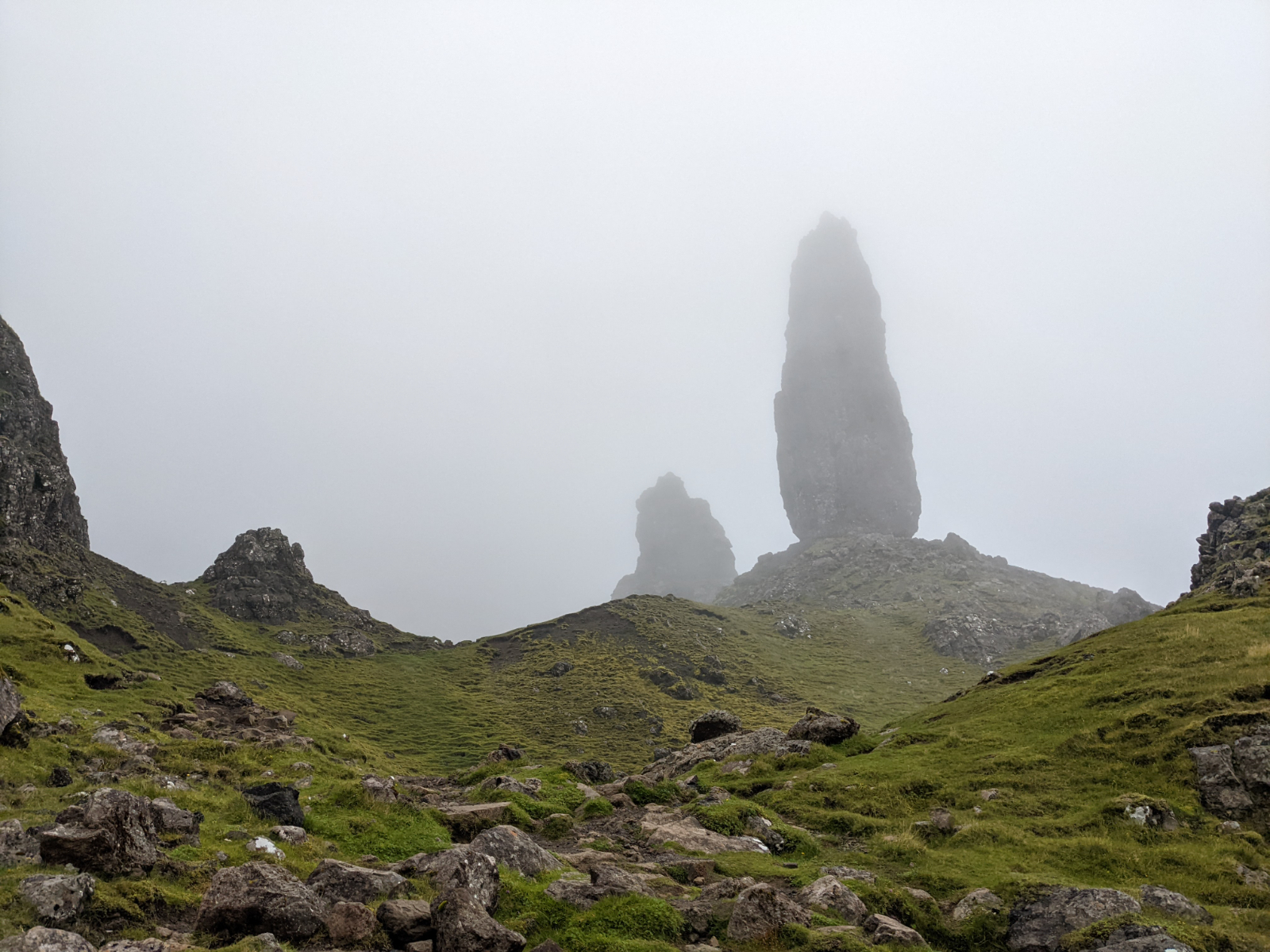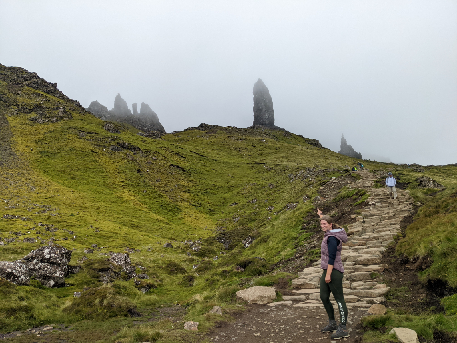 Drüben angekommen fuhren wir direkt zur geplanten Wanderstartplatz. Vom Parkplatz konnte man den „Old Man of Storr“ bereits sehen. Der große Felsen, der an einen Hinkelstein erinnert, war in tief hängende Wolken gehüllt. Der Aufstieg klang nicht weiter schwierig, ungefähr 2 Stunden sollte es dauern. Tatsächlich ging es aber ordentlich bergauf! Die Strecke ist nicht weit, aber es sind wohl ca. 400 Höhenmeter zu überwinden. Es geht also ausschließlich bergauf. Mal auf Schotter, mal auf steinstufen, mal auf Erde.. aber immer bergauf! 💪 Wir kamen ordentlich ins Schwitzen und fragten uns schon, weshalb wir in der letzten Nacht auf einem Campingplatz waren! Duschen wäre heute wohl auch angebracht gewesen 🤣