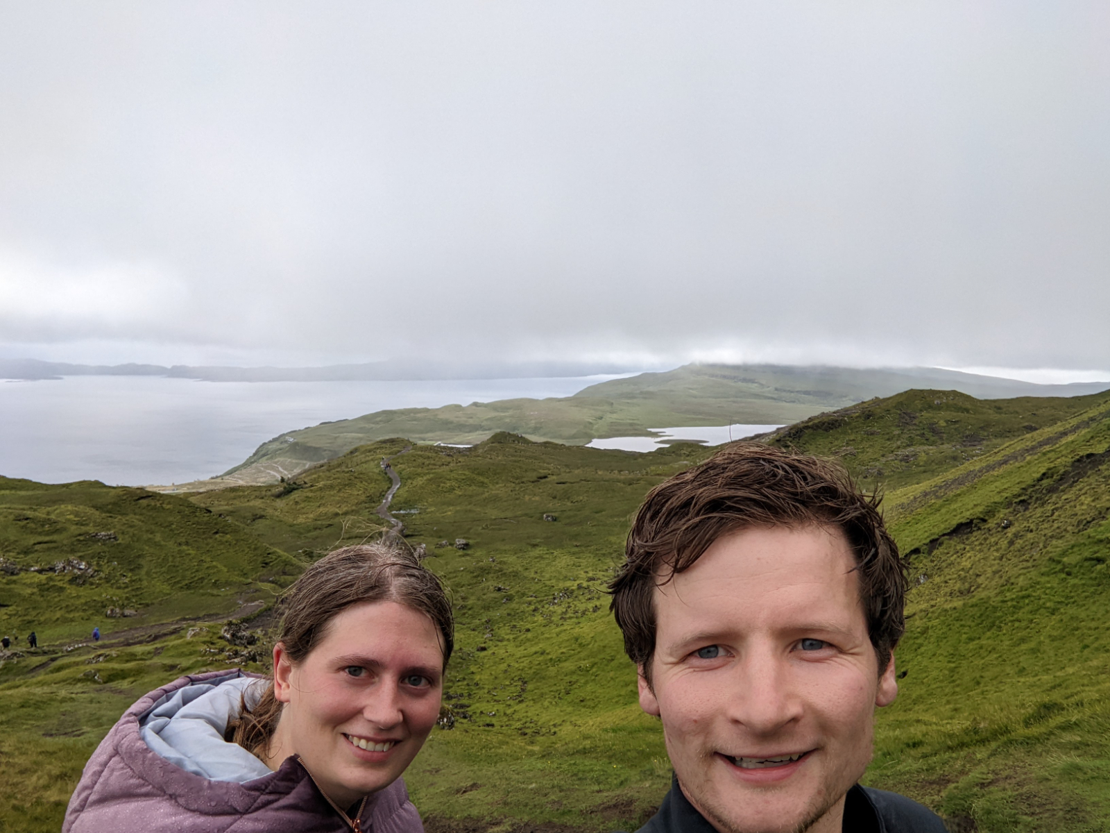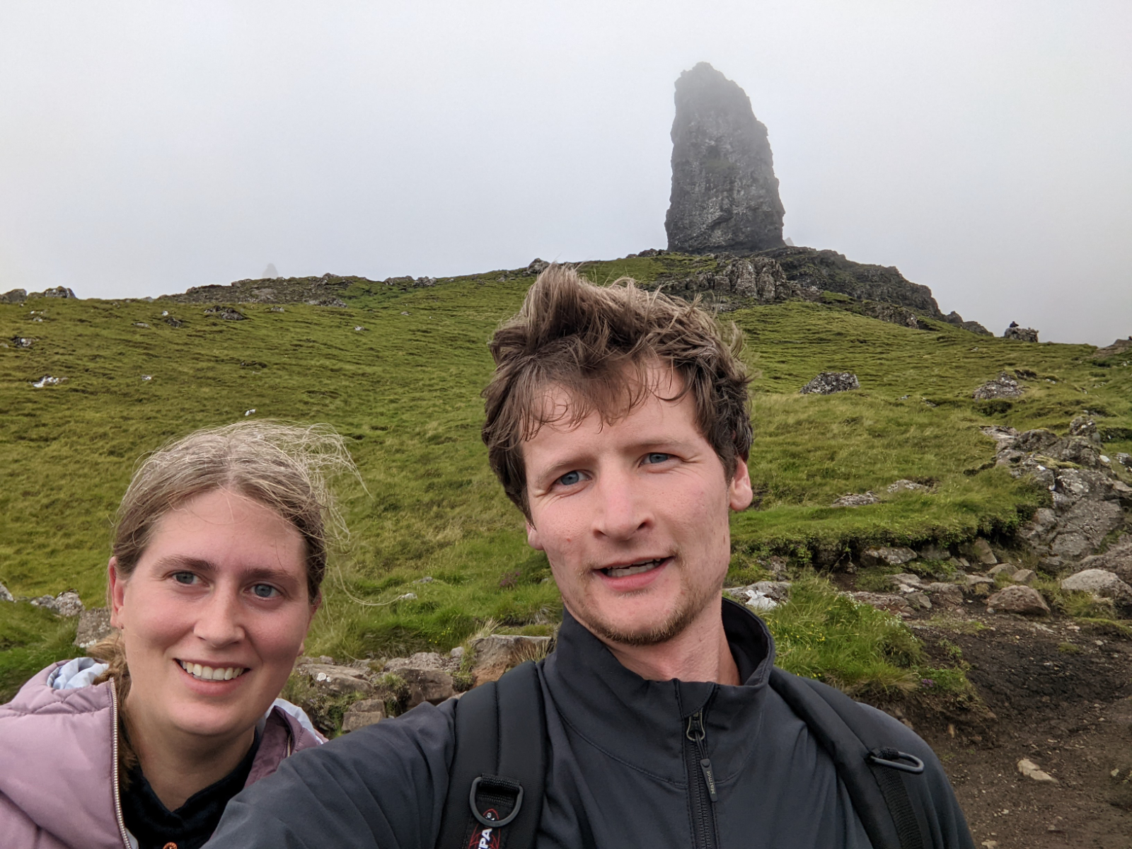 Die nassen Haare, die man auf den Fotos sieht, sind allerdings nur nur schweißnass! Es fing leider immer wieder an zu regnen. Das macht die Aussicht nicht besser, den Wind nicht wärmer und den Boden nicht gerade trittfester. Ich bin immer so ein Ausrutsch-Angst-Haber… rutsche dadurch aber meist nicht. Sven ist dagegen der Sorglose, von dem dann ab und zu ein „Hui!“ und ein schlitterndes Geräusch kommt. Wir sind aber beide gesund und munter, nur eben ziemlich nass, wieder unten angelangt. Der Aufstieg ist wirklich zu empfehlen und hat viel Spaß gemacht! Der Ausblick von oben ist wirklich toll, nicht nur auf den „Old Man“, sondern auch von oben herab auf die Isle of Skye. Das Wetter trübte zwar den Ausblick ein wenig, dafür war die Stimmung bei dem gewaltigen Felsen aber eine ganz besondere.