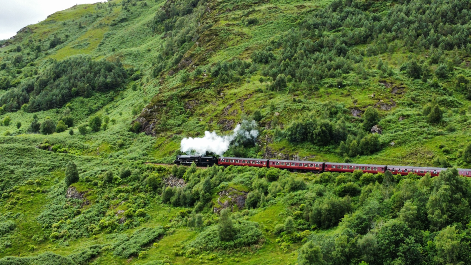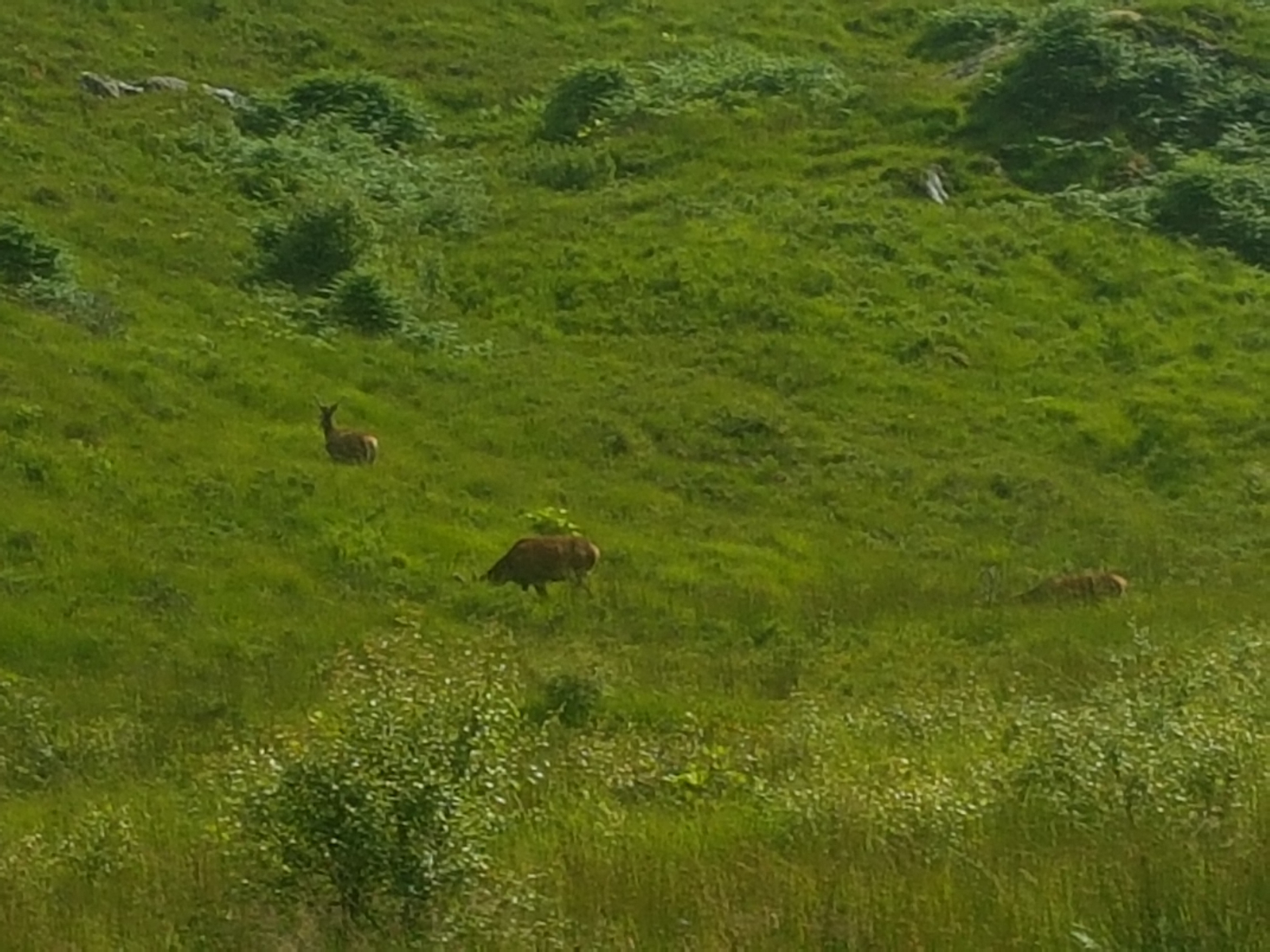 Das Spektakel dauerte eine gute Minute und weg war er wieder. Da es noch verschiedene Viewpoints weiter oben gab, von denen man noch einen schöneren Blick haben sollte, entschieden wir uns dazu, auch noch den nächsten Zug um 15 Uhr abzuwarten. Wir verabschiedeten uns also von meiner Kollegin (die bereits zwei Zugdurchfahrten gesehen hatte) und gingen kurz zum Parkplatz, um vernünftige Schuhe anzuziehen. 😅 Auf dem Weg sahen wir plötzlich zwei Hirsche am Wegesrand grasen! Natürlich… wir sind am belebtesten Ort, den wir bisher in Schottland gesehen hatten, und genau dort stehen dann die Hirsche! 🤷‍♀️