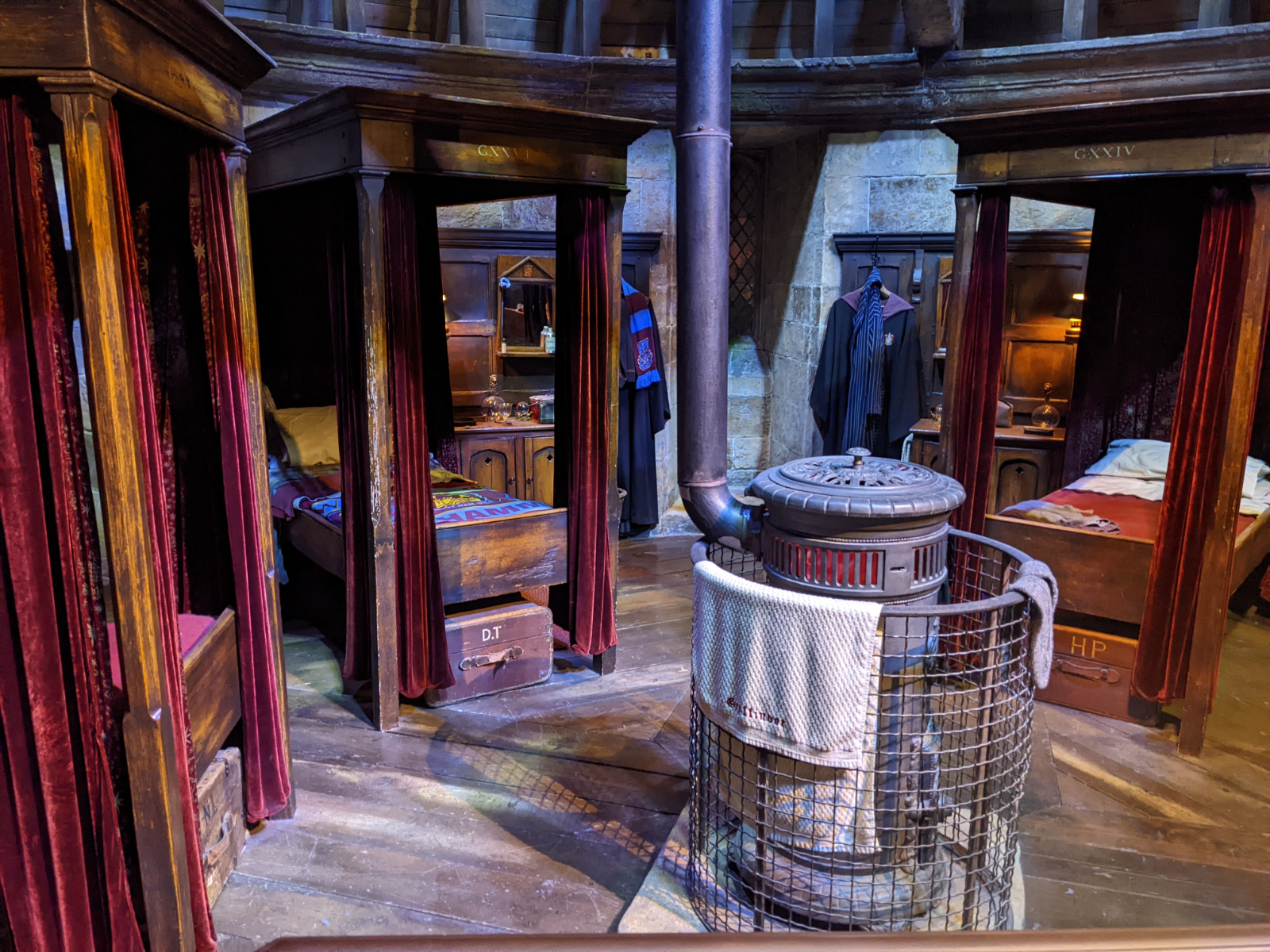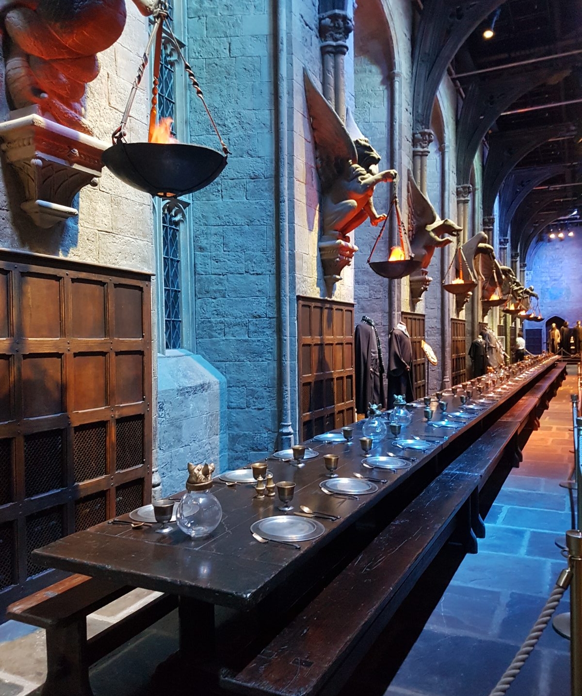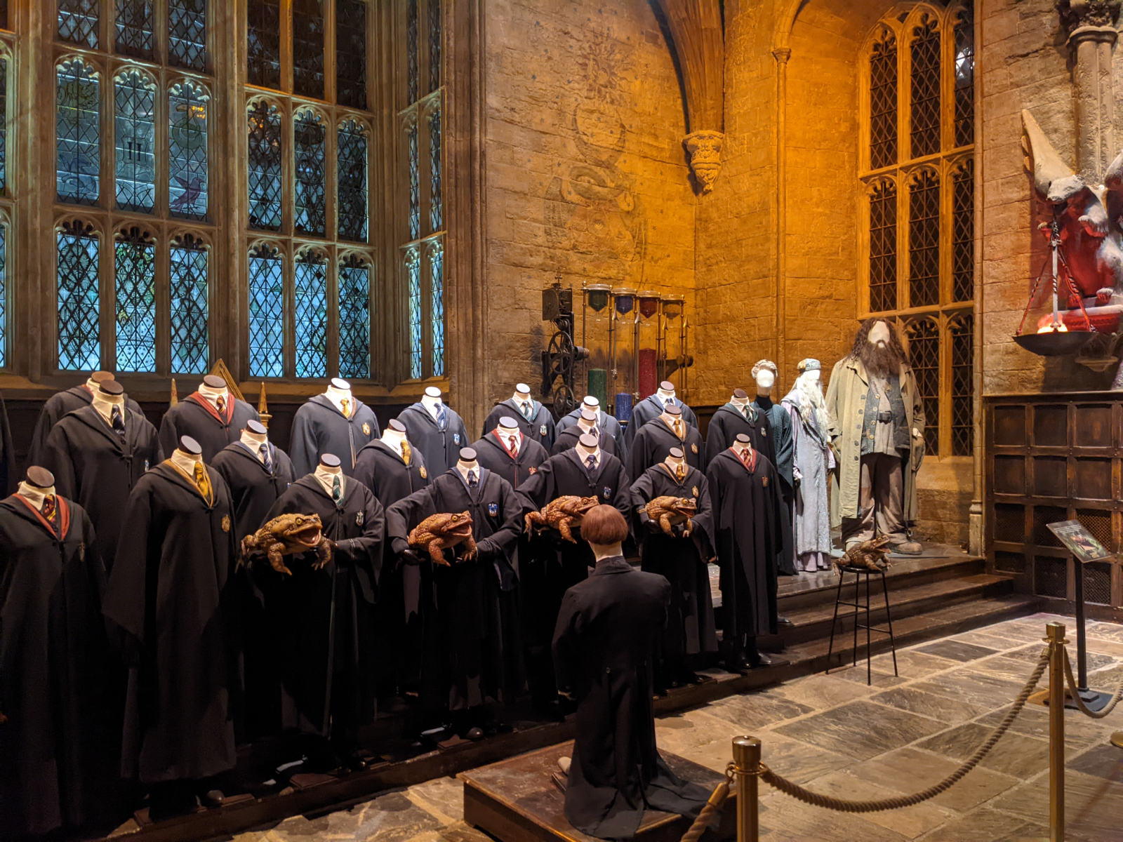 Nun startete die richtige Tour. Zunächst ging es in die große Halle! 2 lange Tische waren aufgebaut und eingedeckt und am Rand standen verschiedene Kostüme, zB. die Schuluniformen der 4 Häuser. Der Boden des Sets besteht tatsächlich aus echtem Stein, was wohl sehr ungewöhnlich für eine Kulisse ist. Vorne, wo eigentlich der Lehrertisch steht, sah man weitere Kostüme zB. von Snape, Filch, Lupin oder Dumbledore. Außerdem war der Schulchor zu sehen und es wurde demonstriert, wie die Kröten das Schullied sangen. Währenddessen fing es langsam an… mein Rücken tat weh. Ganz plötzlich und ohne, dass ich mir das hätte erklären können. Egal wie ich stand, belastete oder nicht belastete, tat es weh. Naja… Zähne zusammenbeißen! Man ist schließlich nur einmal hinter den Kulissen von Harry Potter! 😁