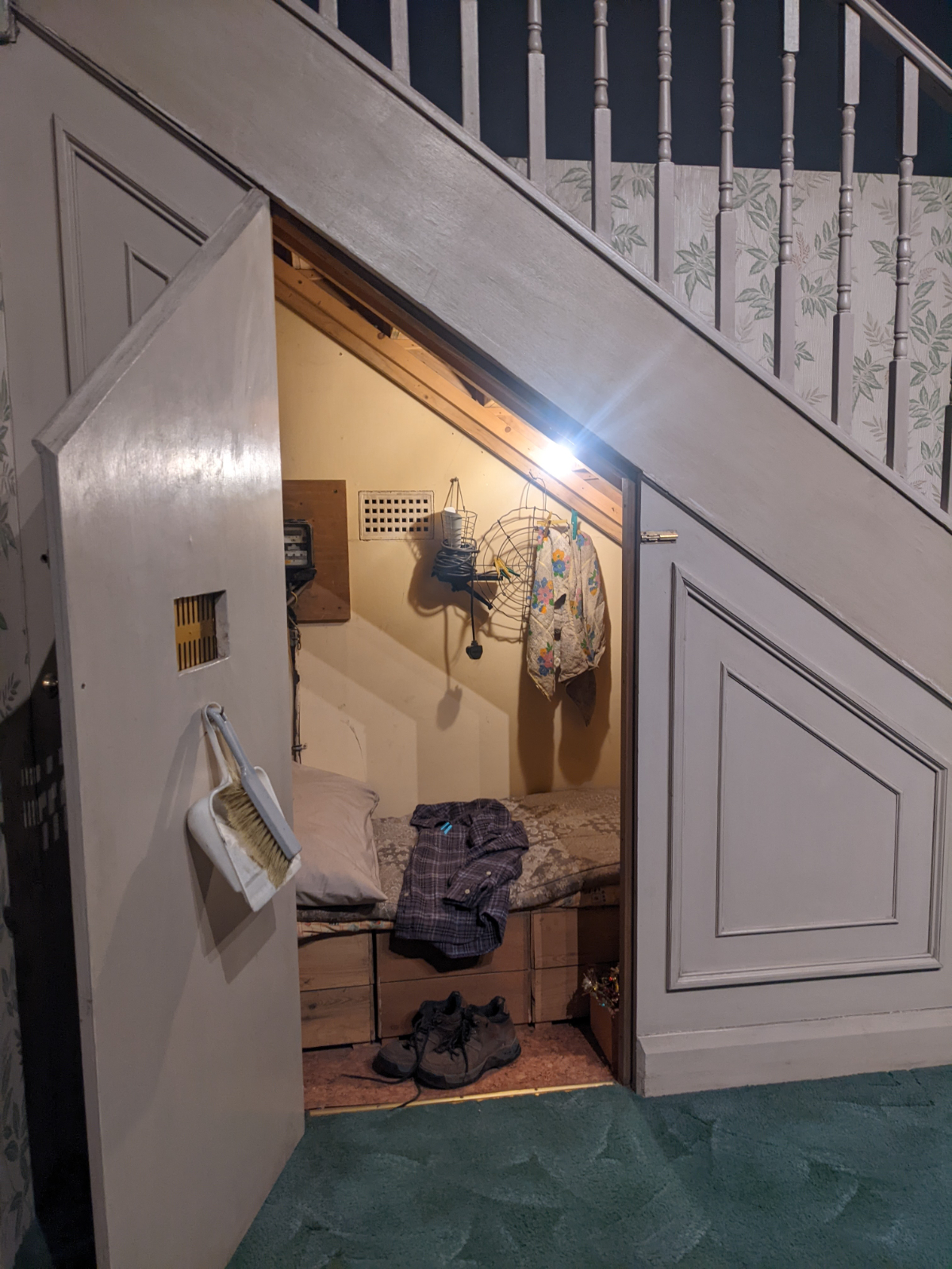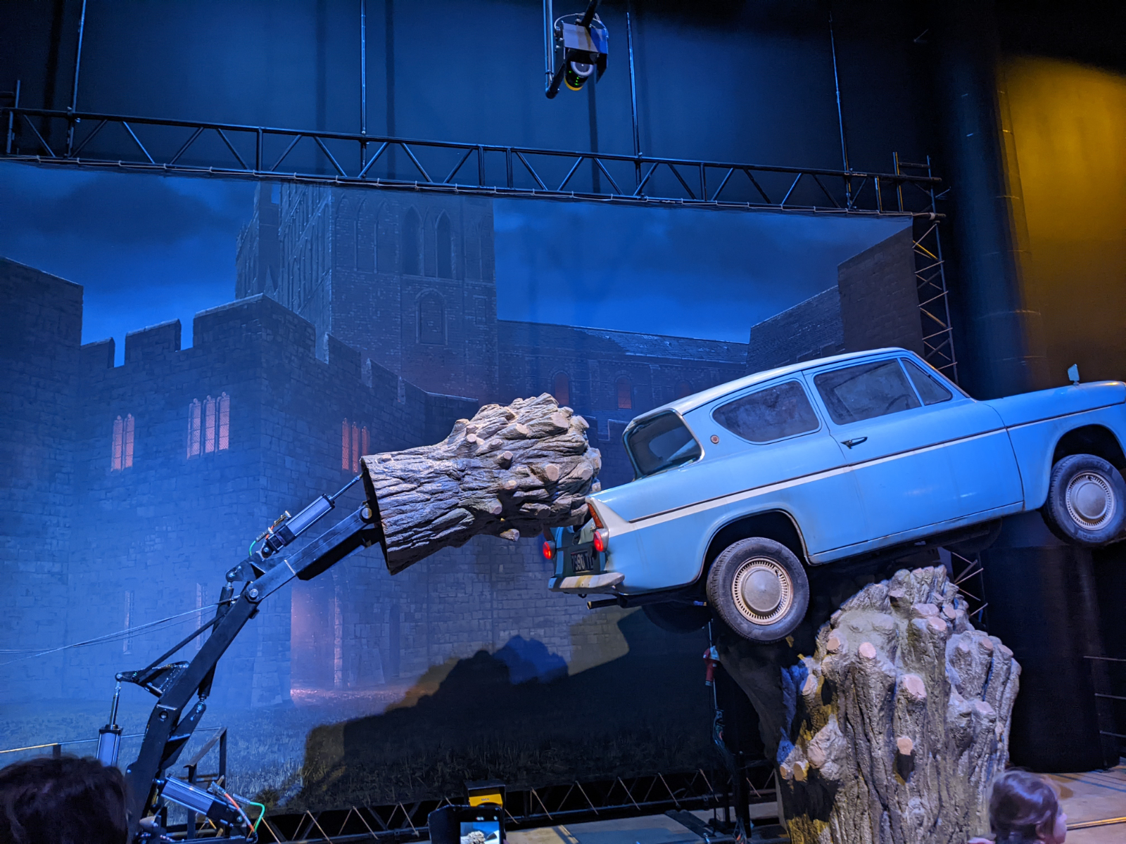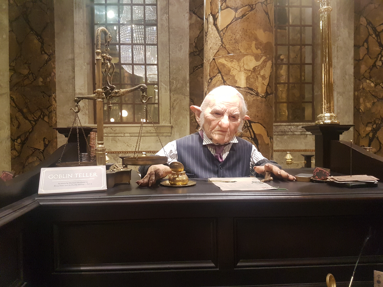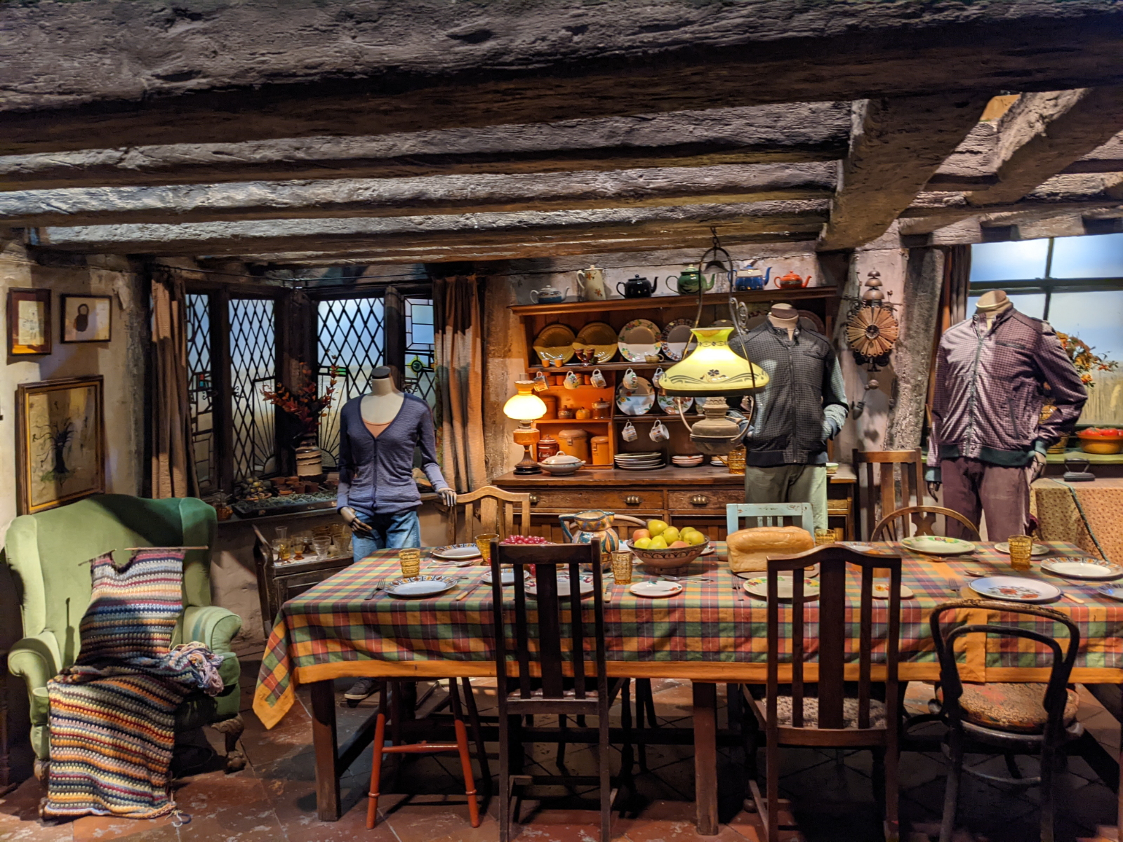 Nun startete die richtige Tour. Zunächst ging es in die große Halle! 2 lange Tische waren aufgebaut und eingedeckt und am Rand standen verschiedene Kostüme, zB. die Schuluniformen der 4 Häuser. Der Boden des Sets besteht tatsächlich aus echtem Stein, was wohl sehr ungewöhnlich für eine Kulisse ist. Vorne, wo eigentlich der Lehrertisch steht, sah man weitere Kostüme zB. von Snape, Filch, Lupin oder Dumbledore. Außerdem war der Schulchor zu sehen und es wurde demonstriert, wie die Kröten das Schullied sangen. Währenddessen fing es langsam an… mein Rücken tat weh. Ganz plötzlich und ohne, dass ich mir das hätte erklären können. Egal wie ich stand, belastete oder nicht belastete, tat es weh. Naja… Zähne zusammenbeißen! Man ist schließlich nur einmal hinter den Kulissen von Harry Potter! 😁