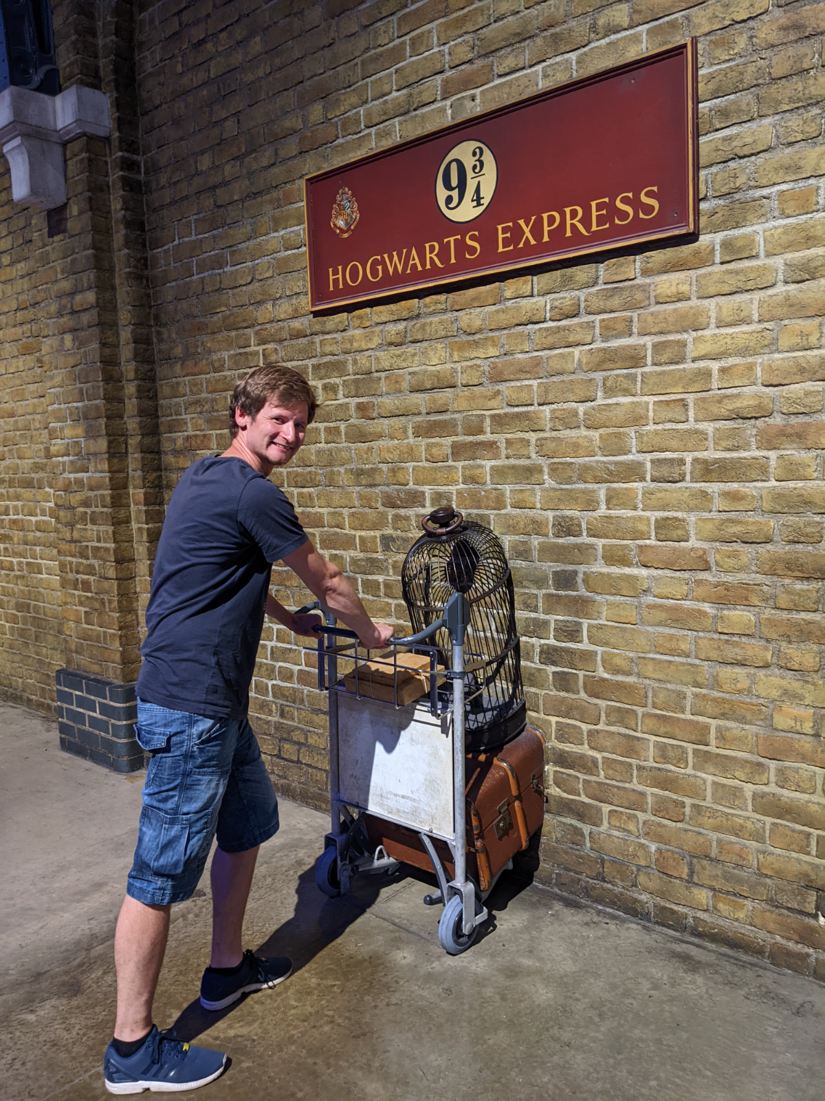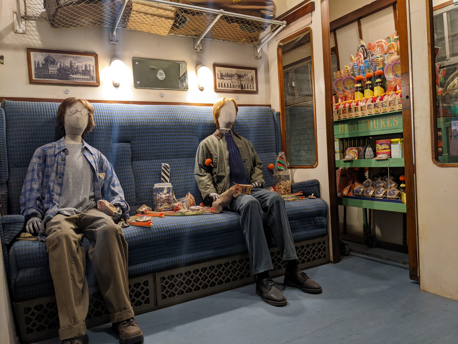 Nächste Station.. King’s Cross und „der echte“ Hogwartsexpress! Hier hätte ich sogar das Foto machen können, das mir aus London fehlte.. ab zum Gleis 9 3/4. Aber egal wie sehr sich Sven auch bemühte, in Fotostimmung war ich schon lange nicht mehr. Einmal durch den Hogwarts Express.. in jedem Abteil konnte man die Requisiten aus einem anderen Filmteil begutachten.