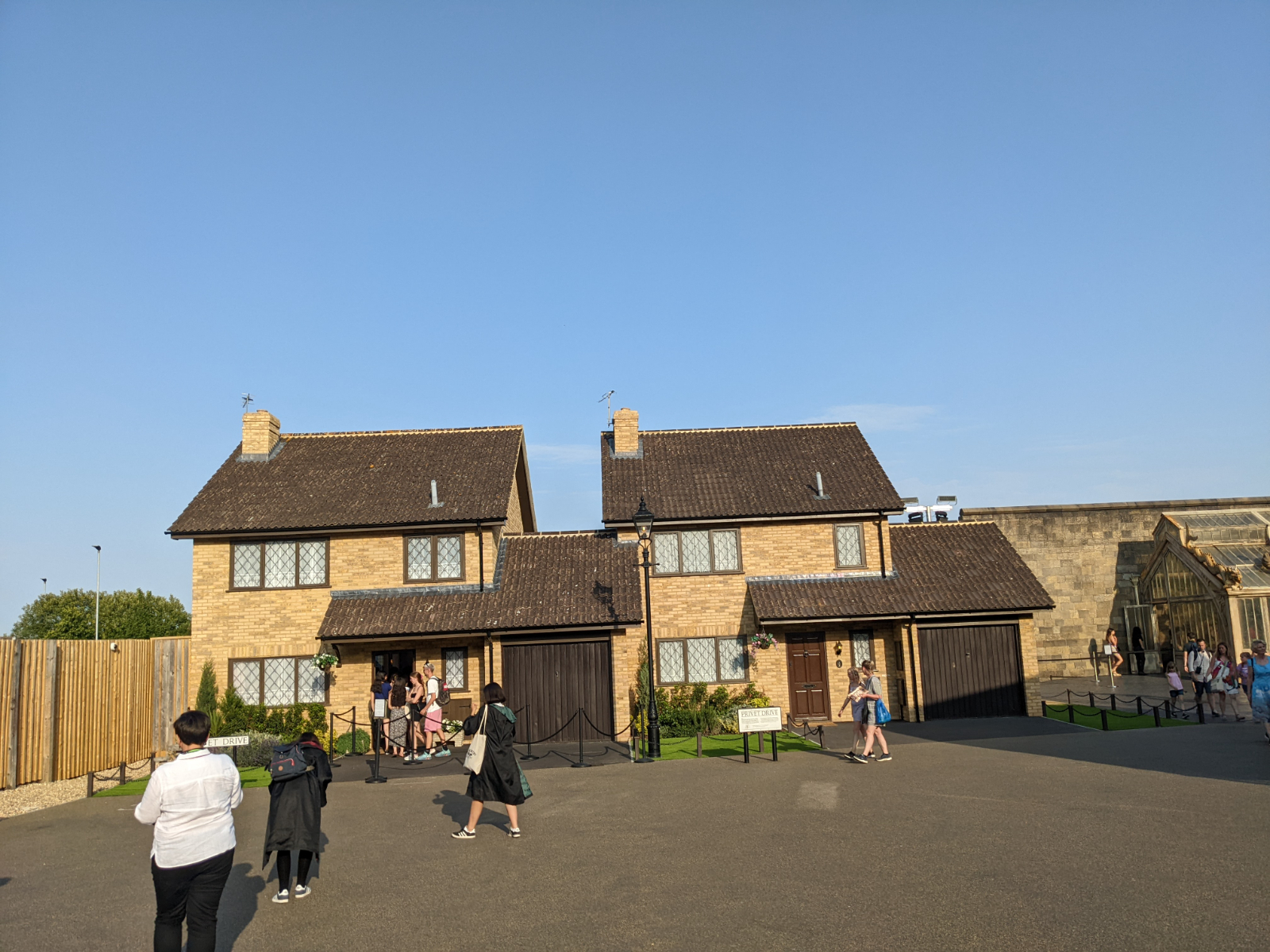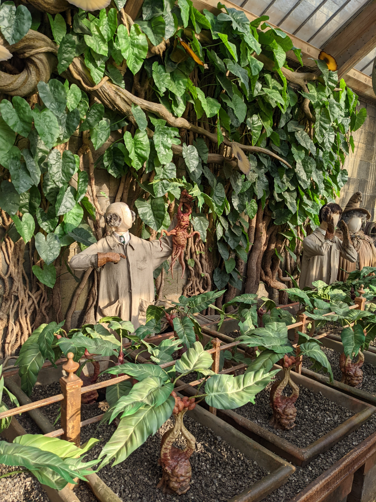 Nun war die erste Halle geschafft, es folgte ein Bereich, wo es etwas zu essen und zu trinken gab und man sogar Butterbier probieren konnte. Allerdings war mir danach inzwischen überhaupt nicht mehr zumute. Also sind wir schnell durchgegangen und auf das Außengelände gelangt. Puh, war das warm hier! Wir konnten das Haus der Dursleys, den fahrenden Ritter und das Gewächshaus mit den Alraunen bestaunen. Außerdem standen in der Mitte am Brunnen ein paar Bänke. Dort machte ich dann etwas Pause, während Sven sich die Sachen genauer anschauen konnte. Doch auch sitzen half mir gar nicht.. ich fühlte mich immer schlechter.