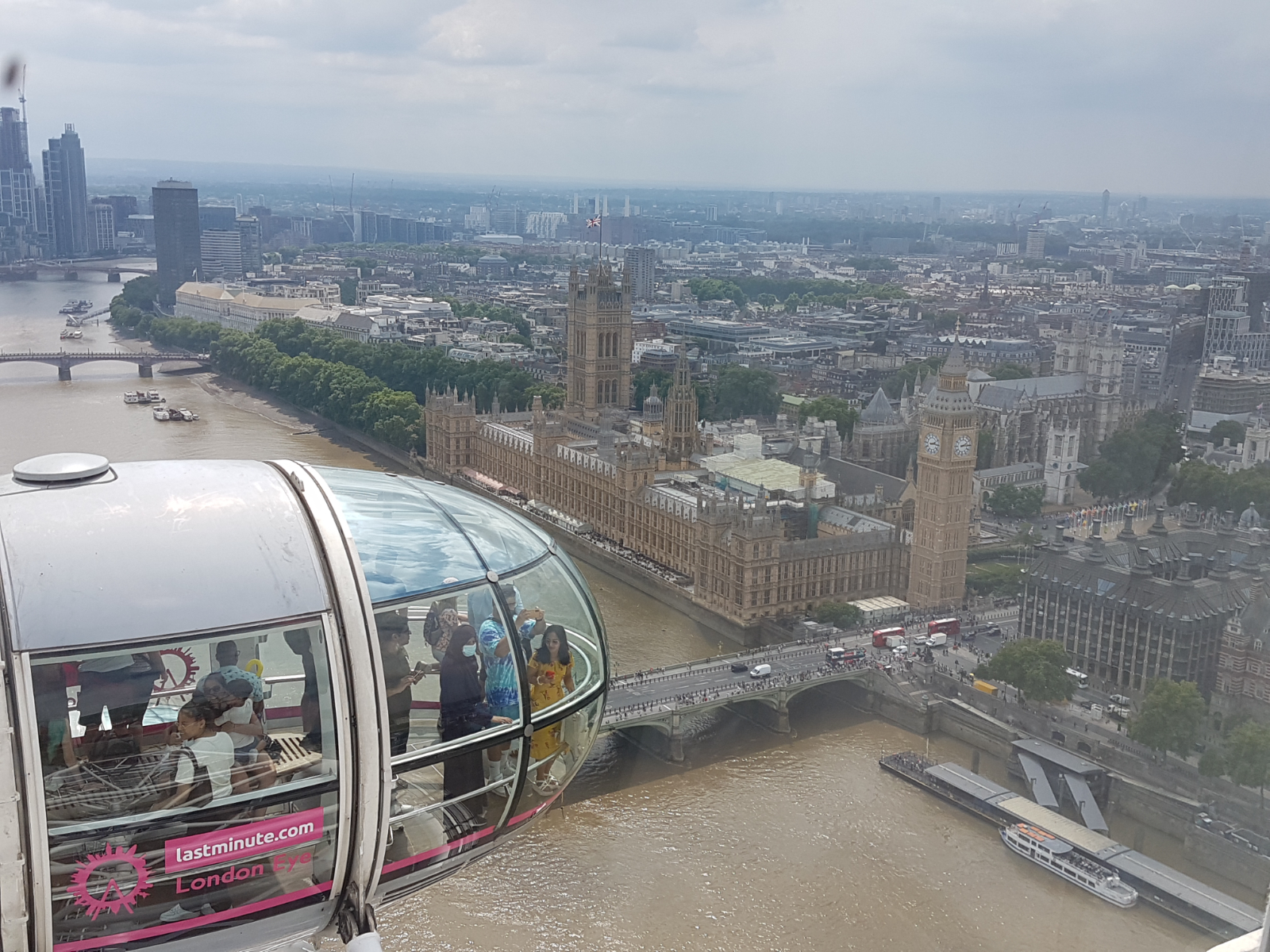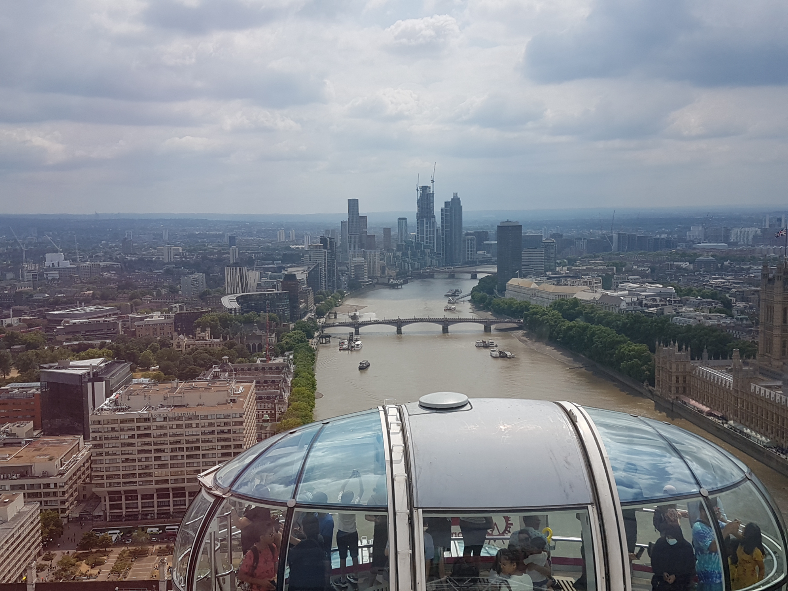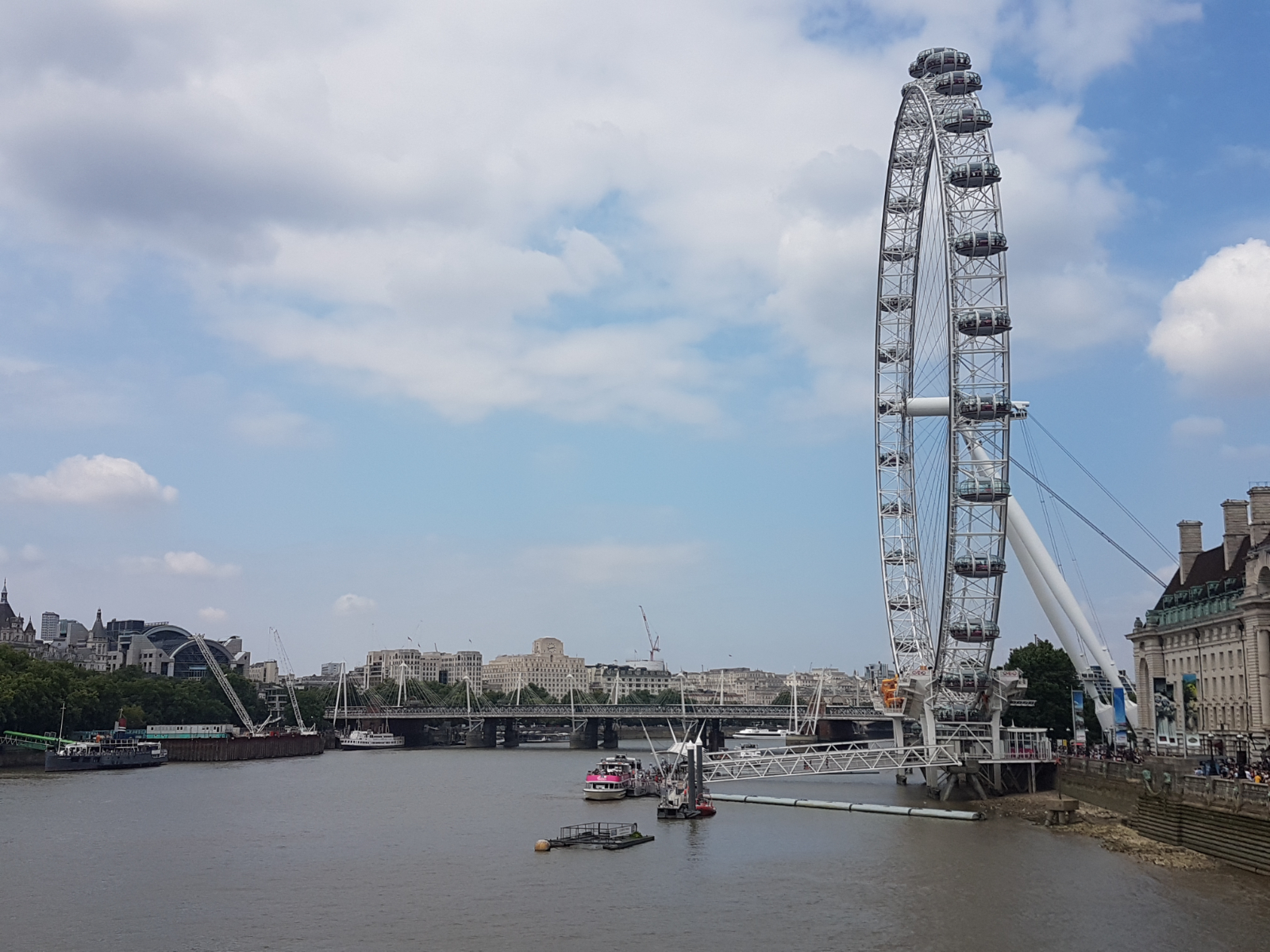 Obwohl es letzte Nacht etwas abgekühlt ist, war es schon echt eine warme Nacht im Bus. Wir hatten natürlich wieder alle Türen auf, die möglich sind, aber wenn es draußen warm ist, ist es drinnen halt auch warm 😅 Wir sind also tendenziell früh aufgewacht und durch Svens morgendlichen Tatendrang auch halbwegs früh aufgestanden. Eine letzte Dusche auf dem Campingplatz und dann sind wir losgefahren. Wir hatten um 13:45 Uhr das London Eye gebucht, sodass wir einen festen Termin hatten, wann wir dort sein mussten. Aber zunächst mussten wir zu einem Parkplatz für Basti fahren und das OHNE in die tolle Umweltzone zu gelangen. Gar nicht so einfach.. es war einiges an Stau in der Nähe Londons, sodass das Navi immer wieder durch die Umweltzone wollte. Klar, die Stunde Stau hätten wir uns auch gerne gespart! 😅 Ging allerdings nicht anders und so hörten wir Harry Potter und der Gefangene von Azkaban und standen im Stau. Wir fuhren zu unserem bereits bekannten Bahnhof „Ewell West“, von dem aus man problemlos nach London rein fahren kann. Außerdem konnten wir hier bargeldlos das Parken bezahlen. Wir sind tatsächlich den gesamten Urlaub ohne Bargeld ausgekommen! Total praktisch, dass wir nicht ständig auf der Suche nach einem Geldautomaten sein mussten. Egal ob parken, Eis oder Naschitüte… überall kann man mit Karte bezahlen, egal wie gering der Betrag ist. Toiletten hatten wir übrigens im gesamten Urlaub kostenlos zur Verfügung.. sehr camperfreundlich die Briten 😉