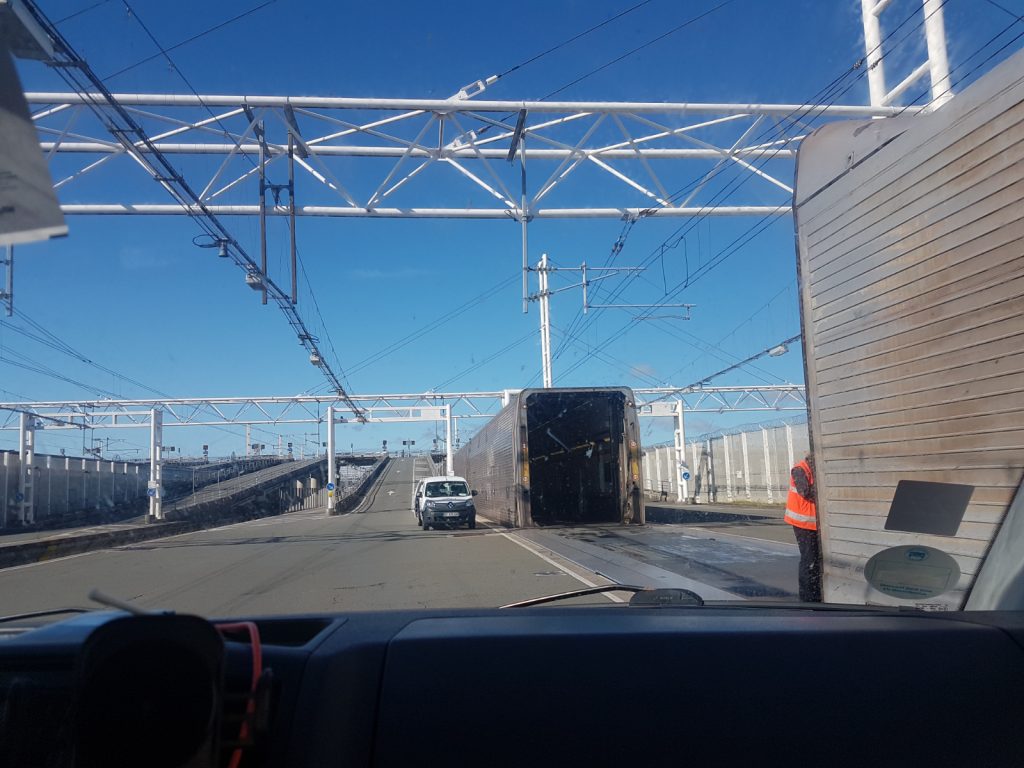 Nachdem wir gestern noch eine Runde Kniffel Extrem gespielt haben, sind wir gegen 23 Uhr schlafen gegangen und haben die Nacht verhältnismäßig gut verbracht. Keiner hat geklopft oder versucht, sich an Basti zu schaffen zu machen 😅 Trotzdem war der Frühaufsteher natürlich schnell wach, sodass wir ganz entspannt zum Eurotunnel fahren konnten und sogar noch eine Tour früher nehmen konnten. Der Zug fährt ca. alle 15 Minuten, sodass es nicht auf die Minute ankam.