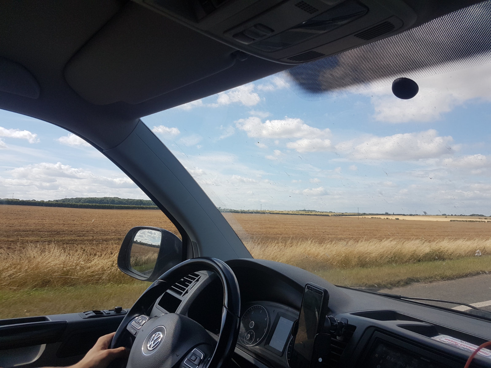 Generell fiel uns während der Fahrt auf, dass wir uns England wirklich nicht so schön vorgestellt hatten! Gefühlt wohnen außerhalb Londons kaum Menschen, sodass wir nur an kleinen, verschlafenen, alten Ortschaften vorbeikommen. Abgesehen von diesen kurzen, abwechslungsreichen Momenten, führte unsere Strecke im Normalfall durchs Grüne. Links und rechts der Straße sind weite Felder zu sehen, überall ist es leicht hügelig (kurzzeitig sogar mit 14% Steigung!) und die wenigen Menschen, die man unterwegs sieht, sind Hundebesitzer beim Gassigehen.