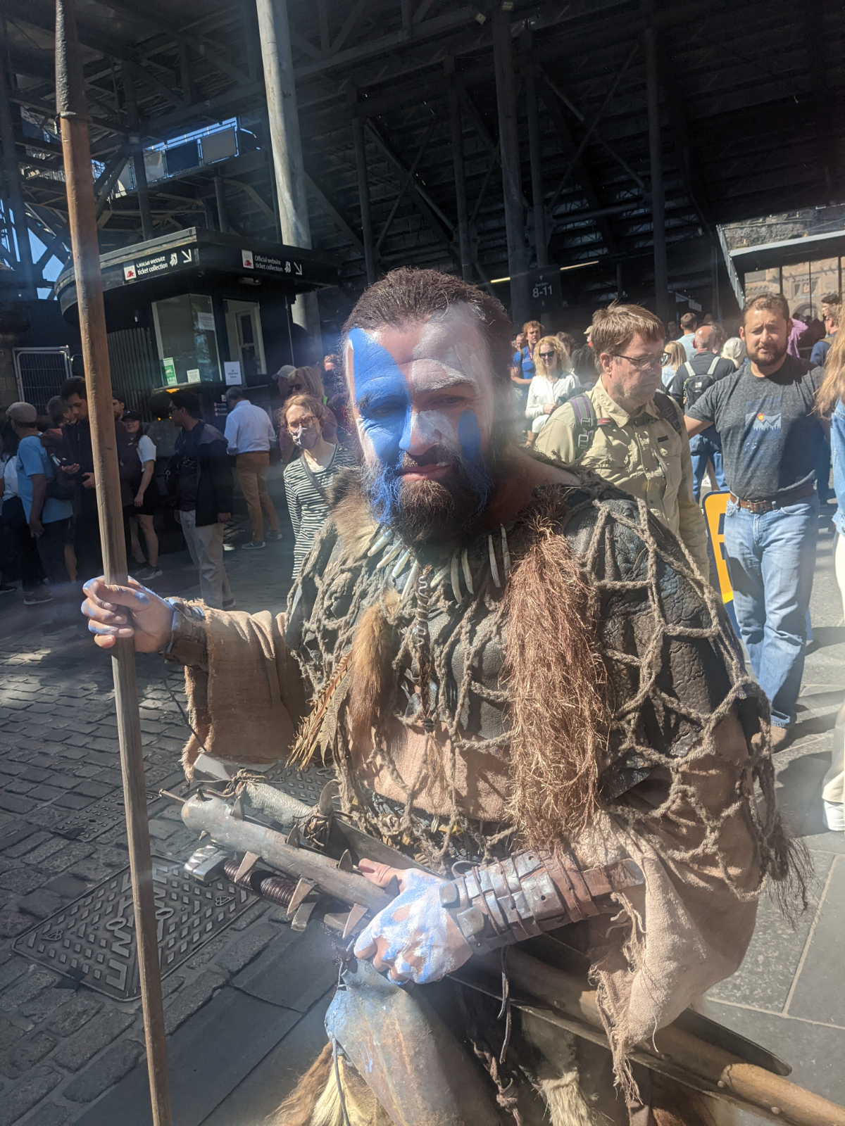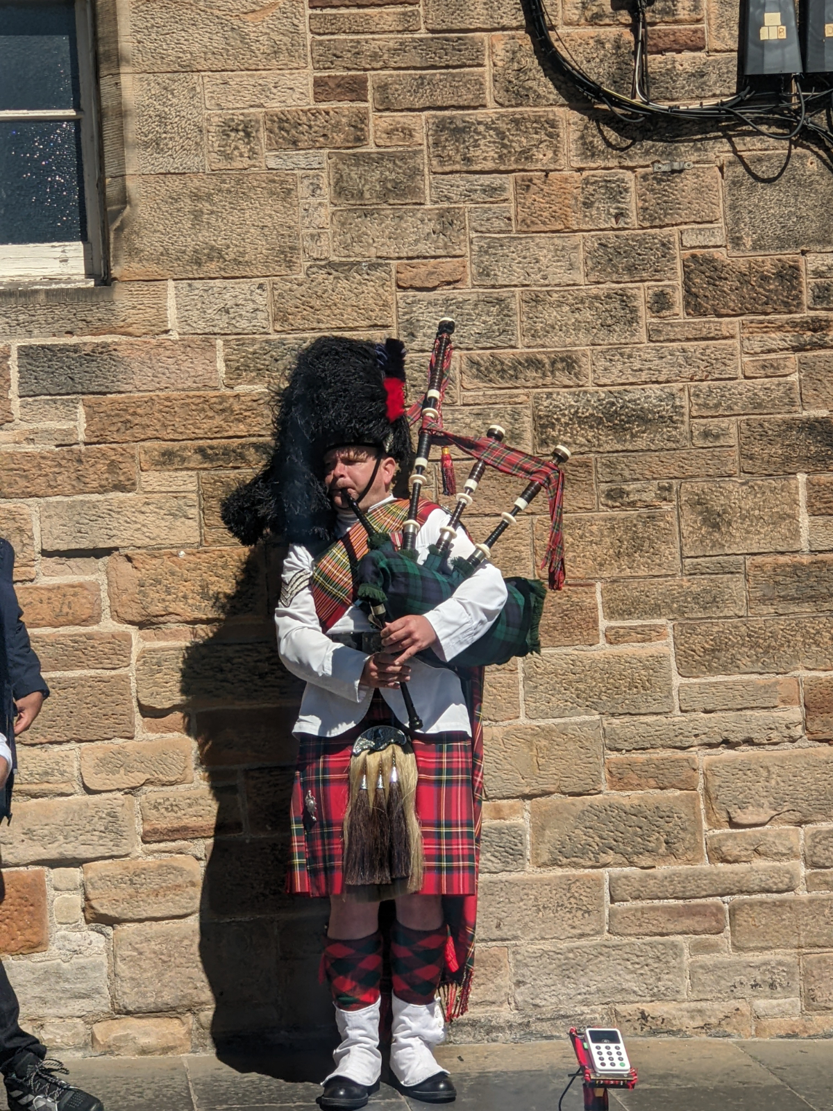 Gegen 11 Uhr kamen wir dann in Edinburgh an. Bereits von Weitem konnten wir die Burg hoch oben bestaunen. Wir parkten ganz in der Nähe und stiefelten zum Eingang. Möp! Mal wieder… keine Tickets mehr vorhanden! Also blieb uns nur der Blick von außen, der sehr schön, aber logischerweise sehr eingeschränkt war. Direkt vor dem Eingang ist eine große Bühne aufgebaut, sodass selbst dieser Blick uns nicht gewährt war. Wir ließen uns davon die Stimmung allerdings nicht vermiesen, sondern wandten uns der schönen Altstadt zu. Direkt von der Castle aus führte die „Royal Mile“, an der heutzutage zwar weniger Royals entlang reiten, dafür aber unzählige kleine Läden liegen. Die Straße war gut besucht, es führten einige Straßenkünstler ihre Aufführungen vor und es herrschte eine tolle Stimmung! Neben unzähligen Souvenirshops (ja, wir mussten auch zuschlagen…) gab es auffällig viele Geschäfte für Stoffe, insbesondere Kaschmir scheint hier berühmt zu sein 🤷‍♀️ Nach einem kleinen Spaziergang durch die Altstadt, bei dem wir auch den ersten Dudelsackspieler in Schottland zu Gesicht bekommen haben, genossen wir mitten in der Fußgängerzone eine Frühstückspizza, es war schließlich schon kurz nach 12, also Pizzazeit! Während wir aßen, wurden neben uns Seifenblasen gemacht, es wurde gesungen und um Punkt 13 Uhr gab es den berühmten Kanonenschuss von Edinburgh zu hören. Auch wenn wir die Castle heute nicht von innen begutachten konnten, war es ein rundum gelungener Tag! Die Altstadt zeigte ihre ganze Schönheit, es reiht sich ein schönes Gebäude nach dem Anderen und auch die Lebendigkeit von Edinburgh sorgt für ein tolles Feeling! Außerdem hatten wir absolut Glück mit dem Wetter! Den ganzen Tag Sonne pur!