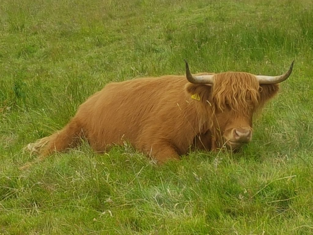 Wie man auf den Fotos erkennen kann, hatten wir erneut tolles Wetter! Kein Tropfen Regen hat uns den Tag vermiest. Wir sind normalerweise im T-Shirt unterwegs, nur wenn die Sonne sich mal hinter ein paar Wolken versteckt und man sich nicht bewegt, kann es Pullover-Temperaturen geben. Auf unserer Fahrt sind wir heute das erste Mal Highland-Rindern begegnet. Die „Zottelkühe“ standen auf jeden Fall auf unserer To-Do-Liste und durch ein lautes „Stoooopp“ meinerseits brachte Sven den Bus schnell zum Stillstand. Ich musste schließlich Hallo sagen! Irgendwie war das Interesse der Zottelkühe an mir nicht so groß wie mein Interesse an ihnen. Zum Aufstehen konnte ich niemanden bewegen…