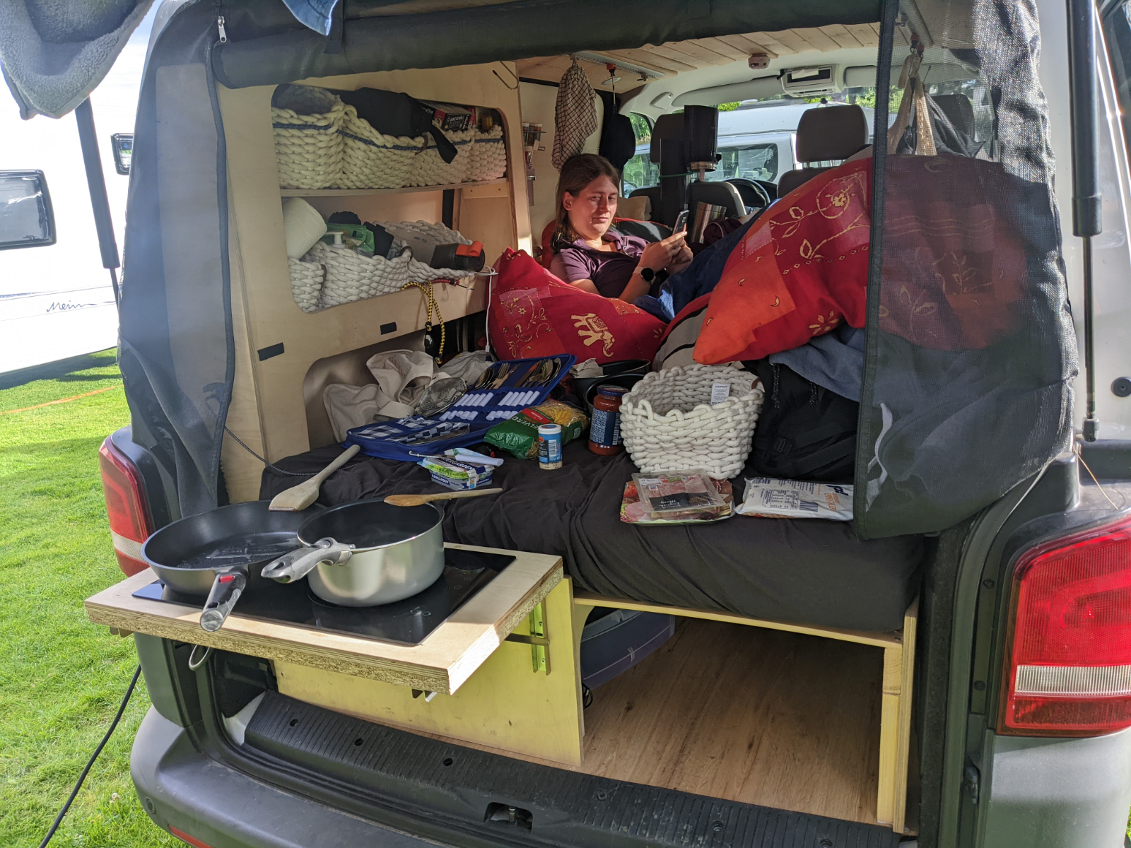 Endlich schläft der Frühaufsteher mal länger als ich! Da wir gestern (aufgrund von Phase 10 und Kniffel) lange aufgeblieben sind, kam es heute das erste Mal vor, dass der Frühaufsteher um 9 Uhr noch geschlafen hat. Er behauptet, dass würde nur am Samstag liegen, aber ich werde meine Theorie verfolgen und ihn abends länger wachhalten. Mal sehen, wie sich das nächsten Tage entwickelt 😏 Wir haben auf jeden Fall gut geschlafen, obwohl es ziemlich windig war. Sven schläft inzwischen unter zwei Decken und erzählt trotzdem noch, dass ihm kalt gewesen sei. Ich kann das kaum glauben.. Wir haben inzwischen einen Haken für Basti, den man am Kofferraumschloss befestigen kann, sodass der Bus abgeschlossen ist, aber trotzdem einen kleinen Spalt offensteht. Dadurch kommt wenigstens ein bisschen Frischluft hinein. Ich persönlich bin da sehr froh drüber 😆